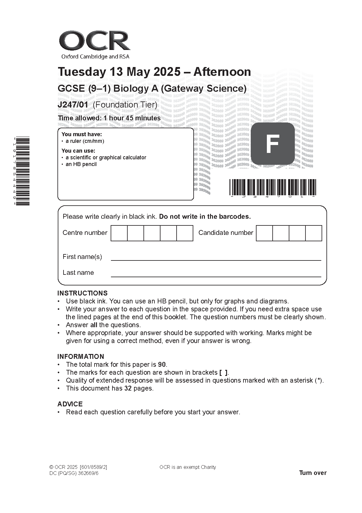 2025 OCR GCSE Biology A Gateway Paper 1 and Mark Scheme Combined (J247/01 (Foundation Tier)