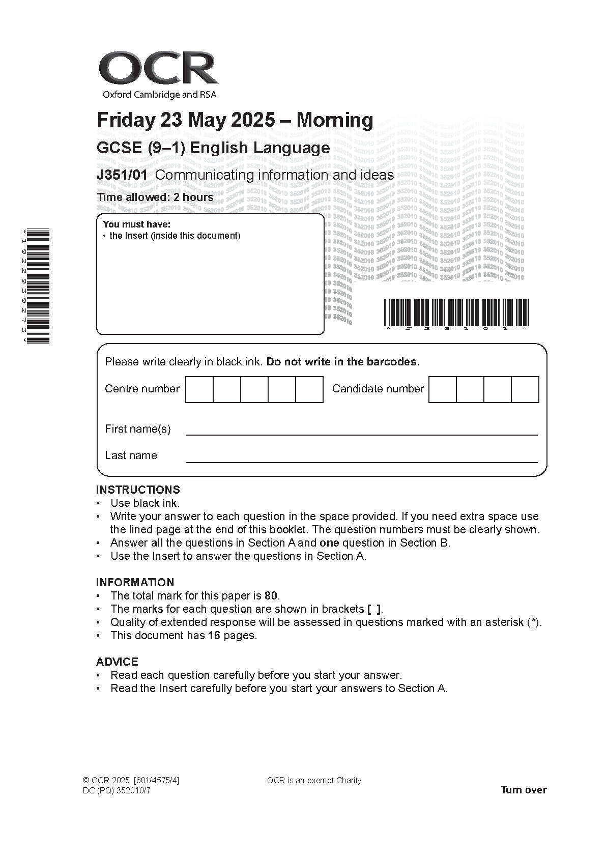 2025 OCR GCSE English Language Paper 1 and Mark Scheme Combined (J351/01 Communicating information and ideas )