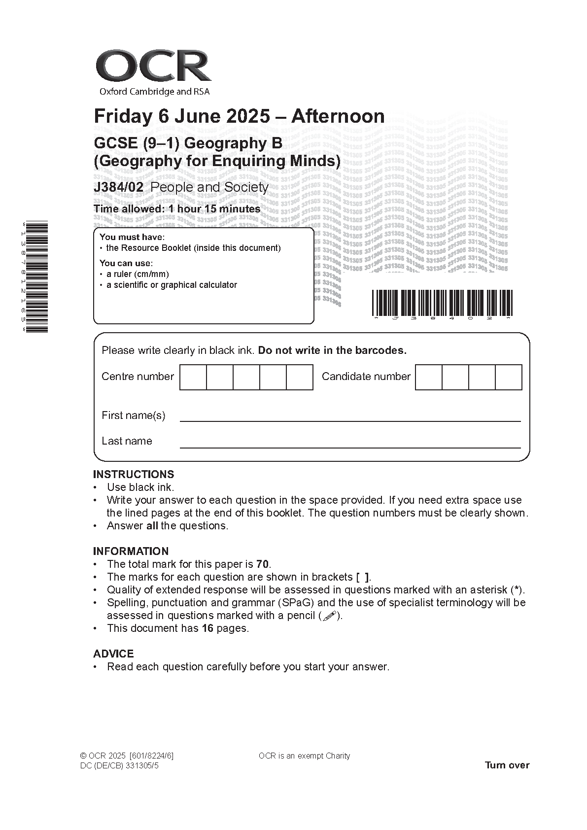 J384/02 – People and Society is the second component of the OCR GCSE (9–1) Geography B: Geography for Enquiring Minds course.