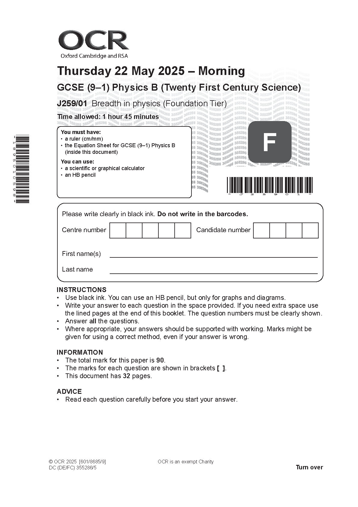 2025 OCR GCSE Physics B Twenty First Century Science Paper 1 and Mark Scheme Combined (J259/01 Breadth in physics (Foundation Tier)