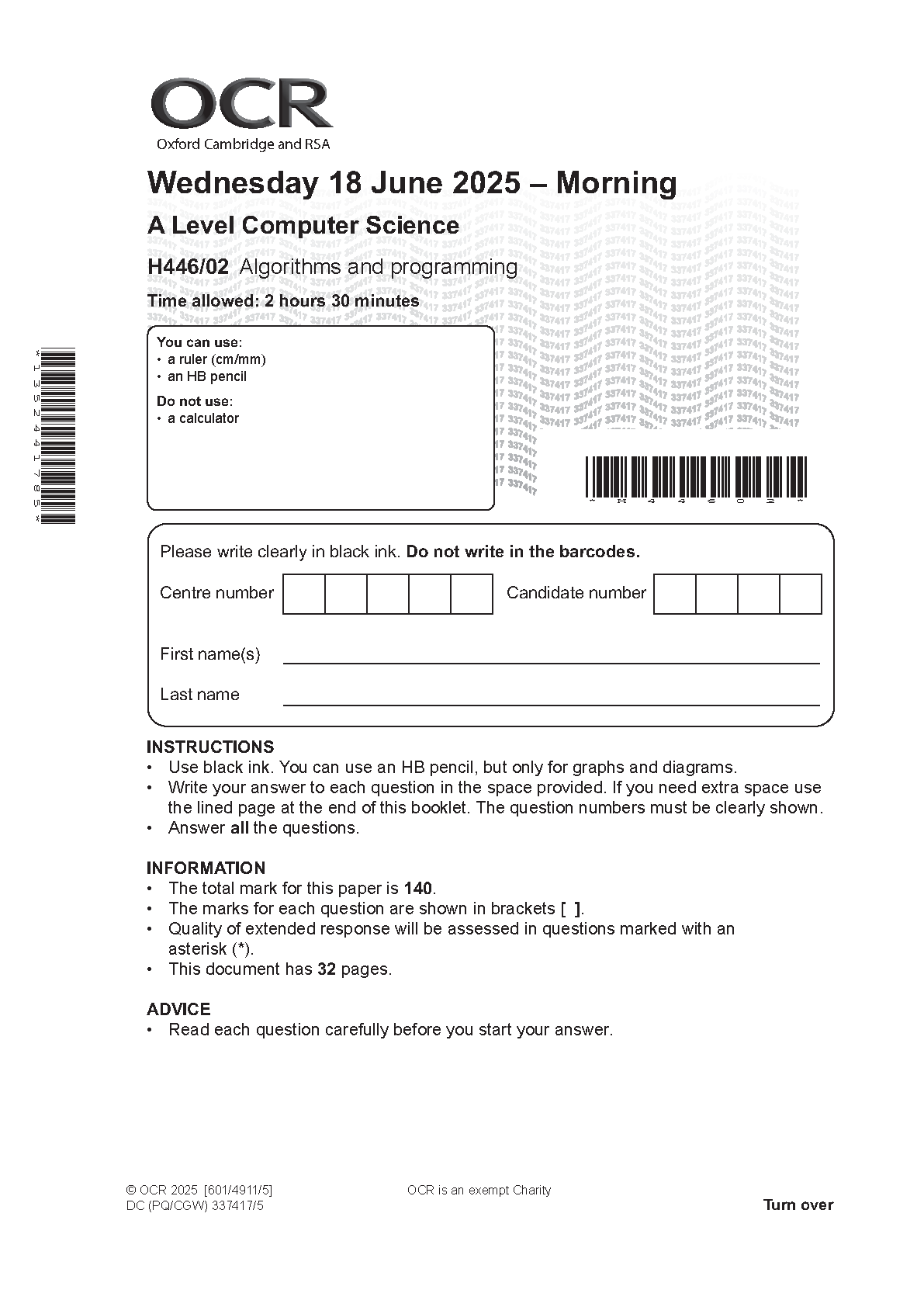 2025 OCR A Level Computer Science Paper 2 and Mark Scheme Combined (H446/02 Algorithms and programming)