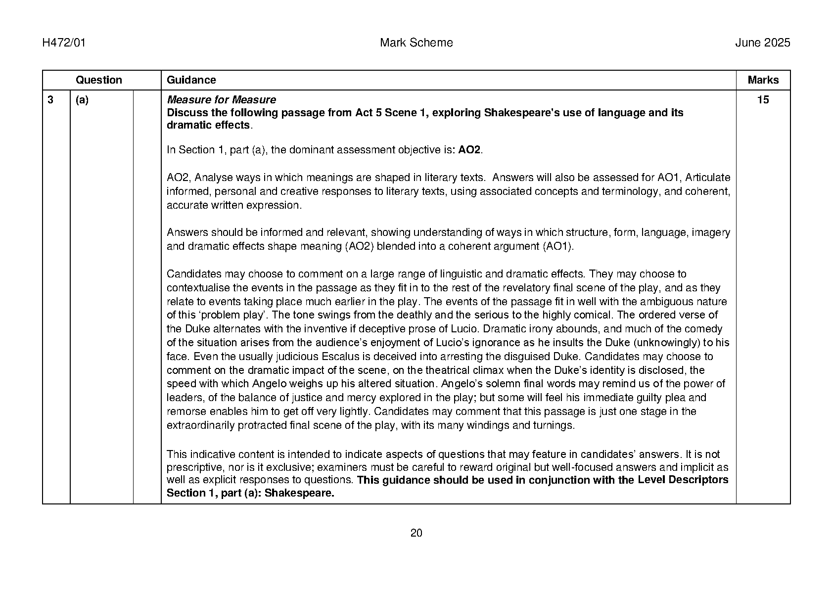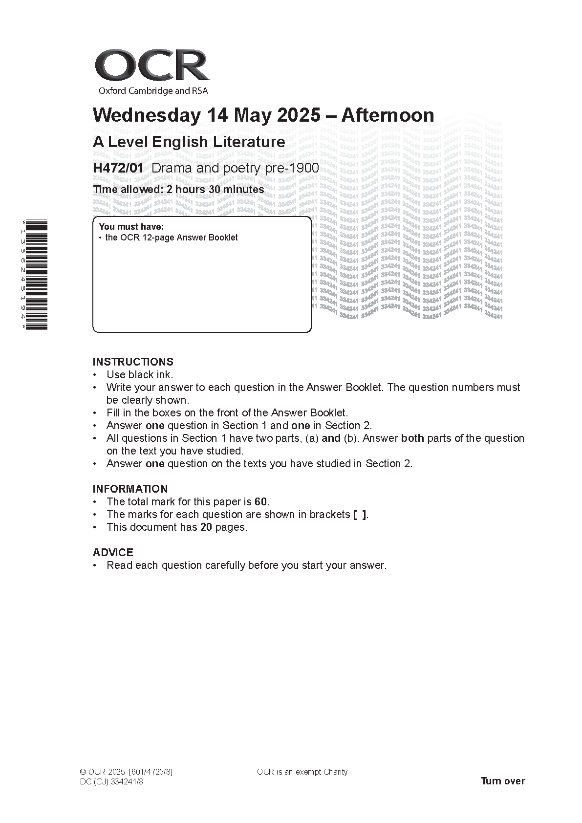 2025 OCR A Level English Literature Paper 1 and Mark Scheme Combined (H472/01 Drama and poetry pre-1900)