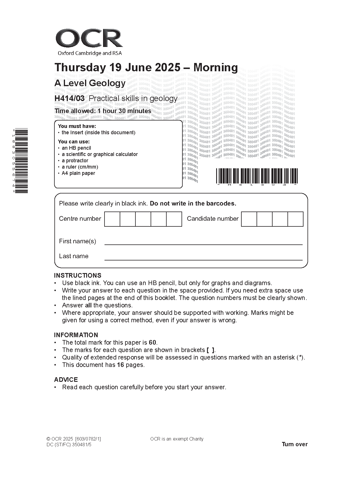 2025 OCR A Level Geology Paper 3 and Mark Scheme Combined (H414/03 Practical skills in geology)
