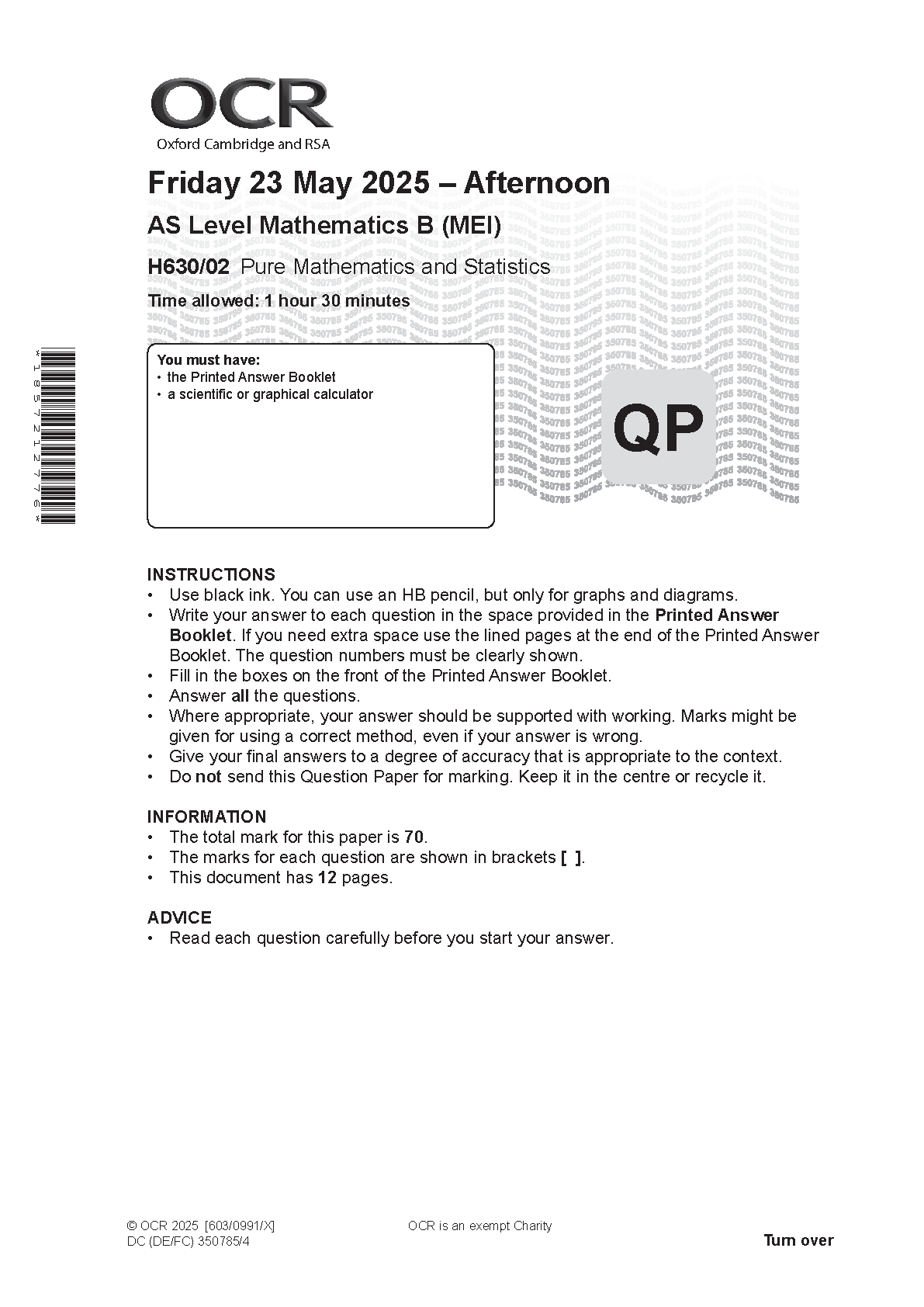 2025 OCR AS Level Mathematics B MEI Paper 2 and Mark Scheme + Insert Combined (H630/02 Pure Mathematics and Statistics)