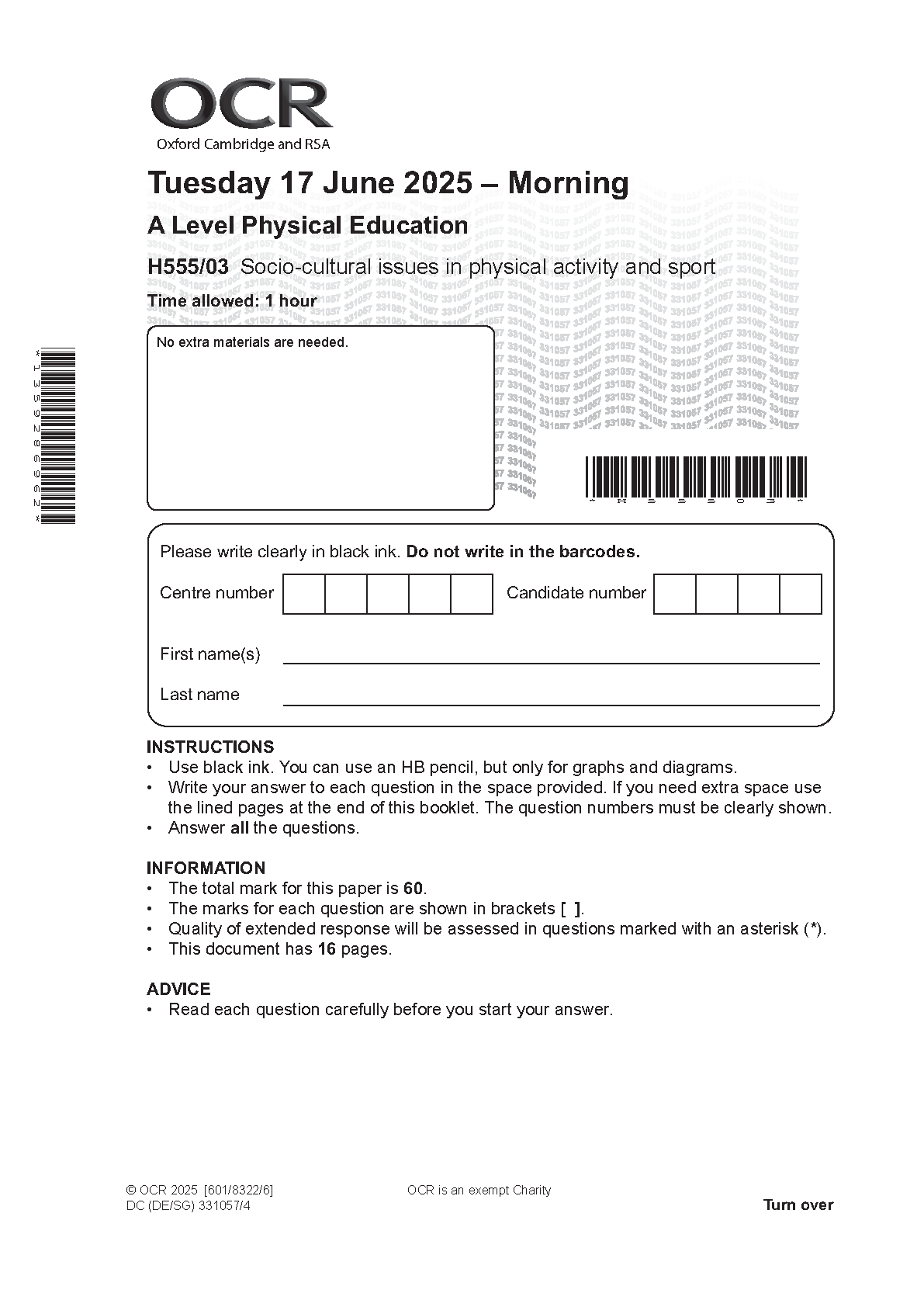 2025 OCR A Level Physical Education Paper 3 and Mark Scheme Combined (H555/03 Socio-cultural issues in physical activity and sport)