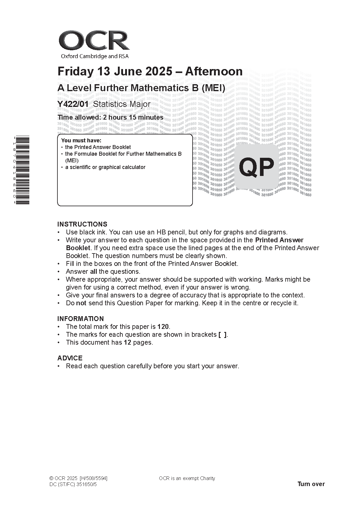 2025 OCR A Level Further Mathematics B (MEI) Paper 1 and Mark Scheme + Insert Combined (Y422/01 Statistics Major)