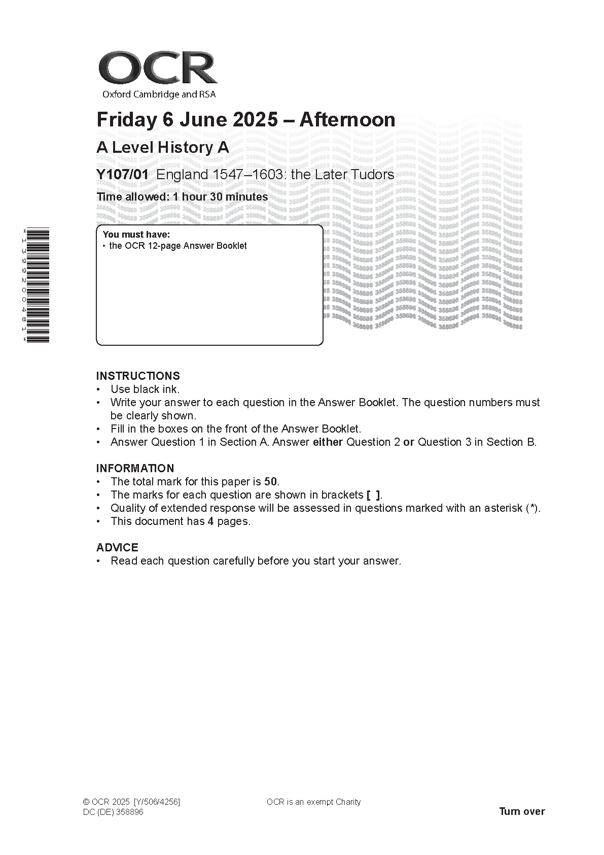 2025 OCR A Level History A Paper 1 and Mark Scheme Combined (Y107/01 England 1547–1603: the Later Tudors )
