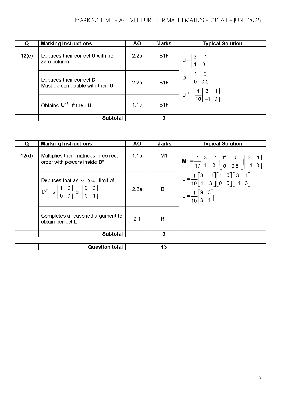 AQA A LEVEL FURTHER MATHEMATICS PAPER 1 2025 MARK SCHEME (7367/1)