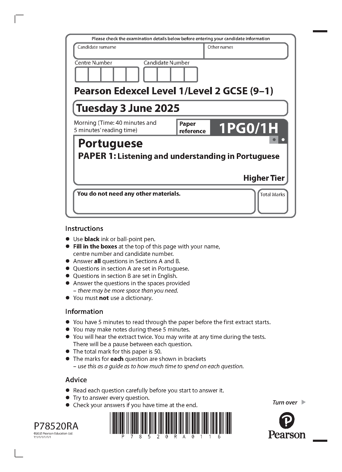 2025 Pearson Edexcel GCSE Portuguese Paper 1H and Mark Scheme Combined (1PG0/1H: Listening and understanding in Portuguese Higher Tier)