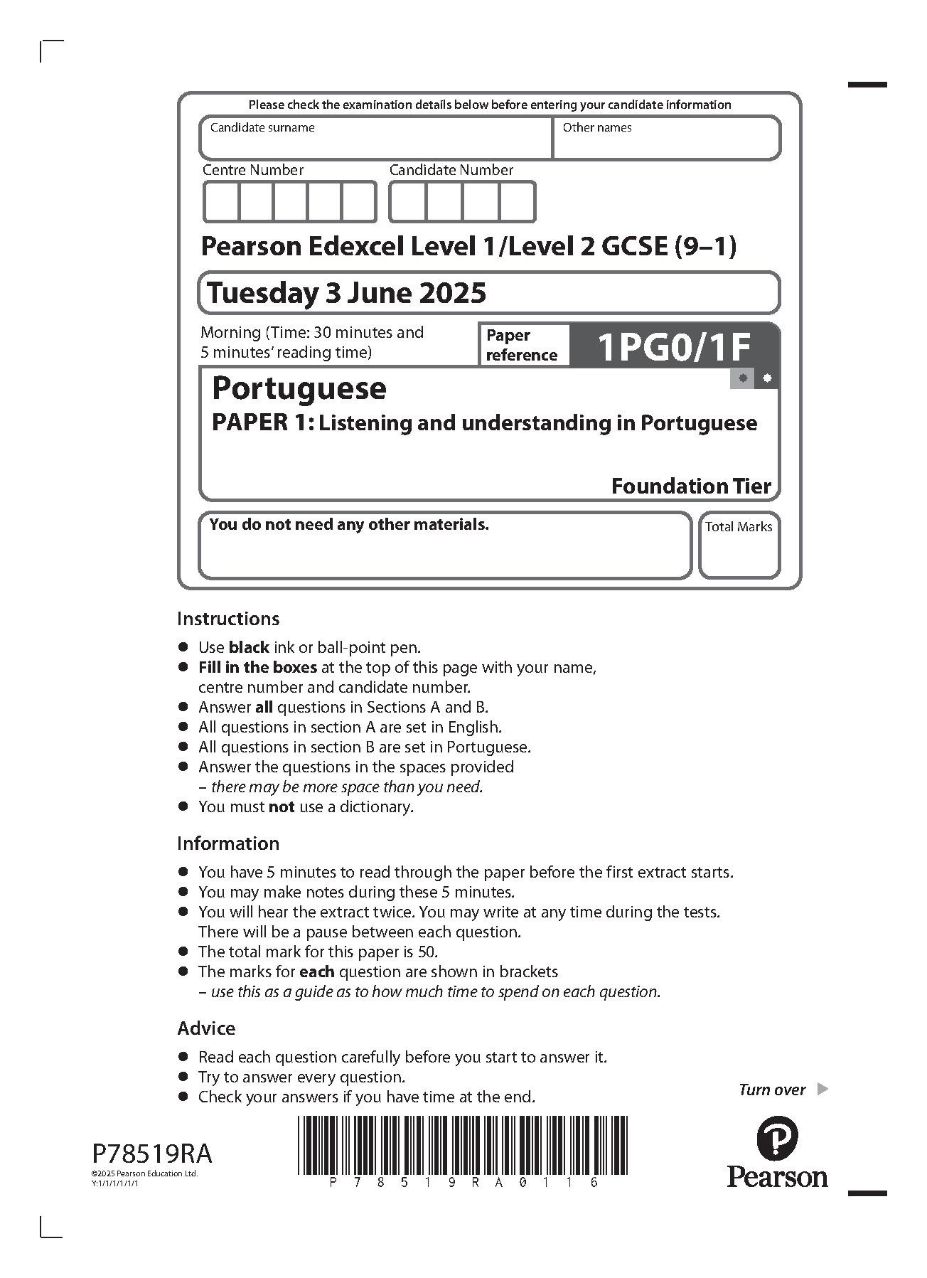 2025 Pearson Edexcel GCSE Portuguese Paper 1F and Mark Scheme Combined (1PG0/1F: Listening and understanding in Portuguese Foundation Tier)