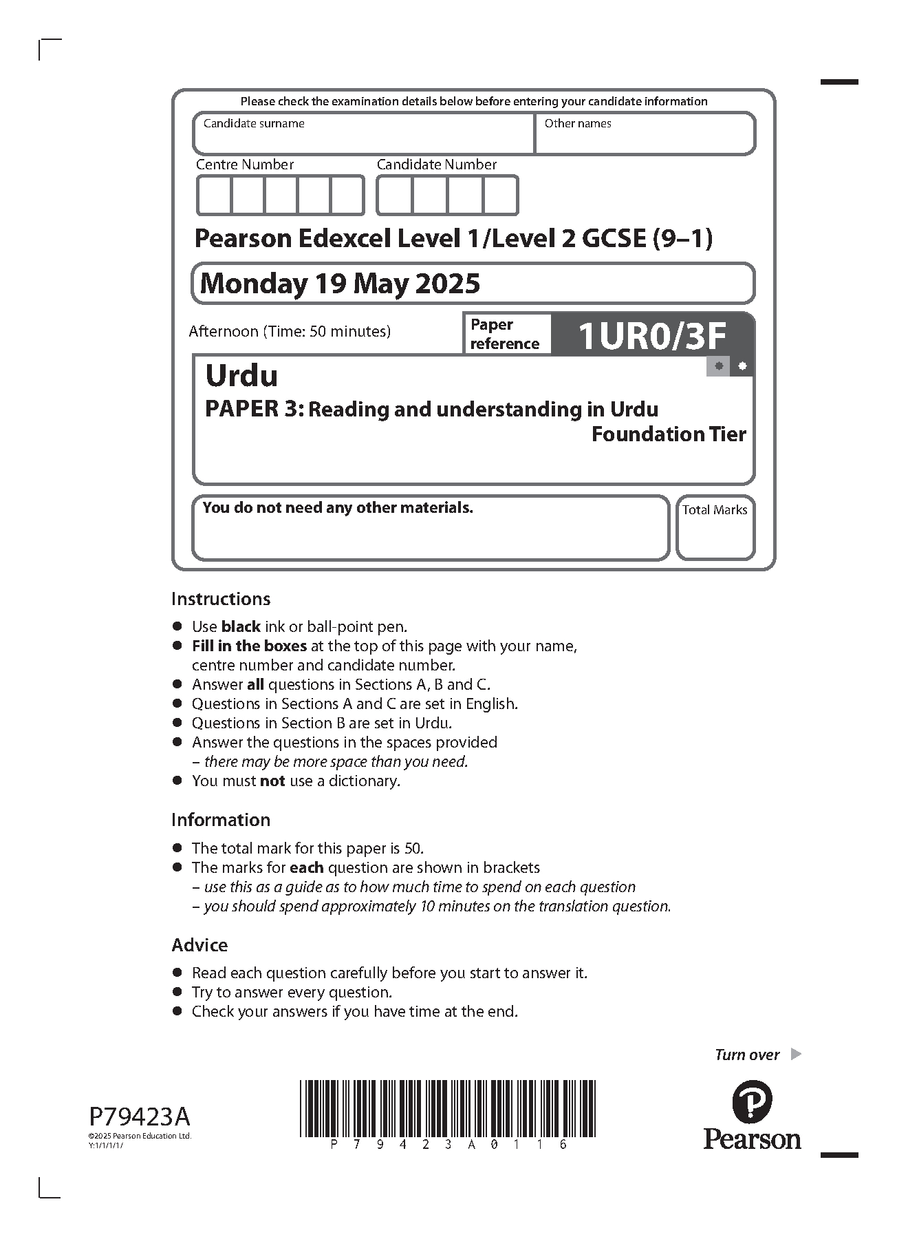 2025 Pearson Edexcel GCSE Urdu Paper 3F and Mark Scheme Combined (1UR0/3F: Reading and understanding in Urdu Foundation Tier)