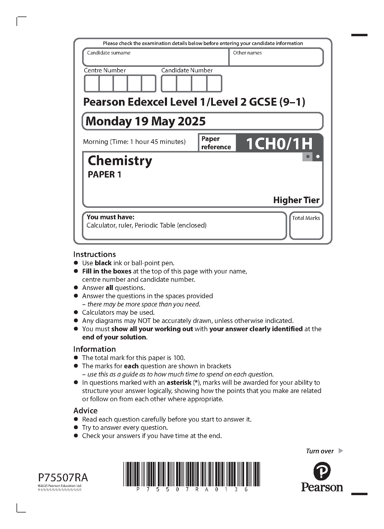2025 Pearson Edexcel GCSE Chemistry Paper 1H and Mark Scheme Combined (1CH0/1H: Higher Tier)