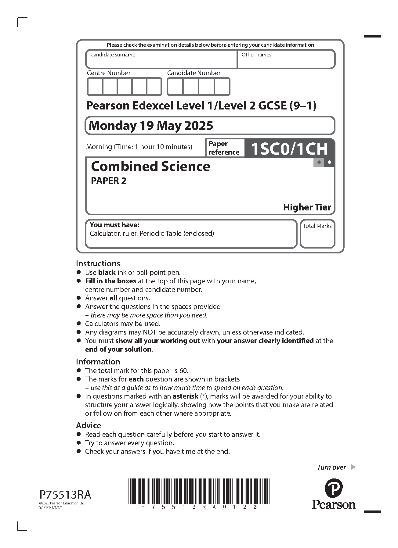 2025 Pearson Edexcel GCSE Combined Science Chemistry Paper 2 and Mark Scheme Combined (1SC0/1CH: Higher Tier)