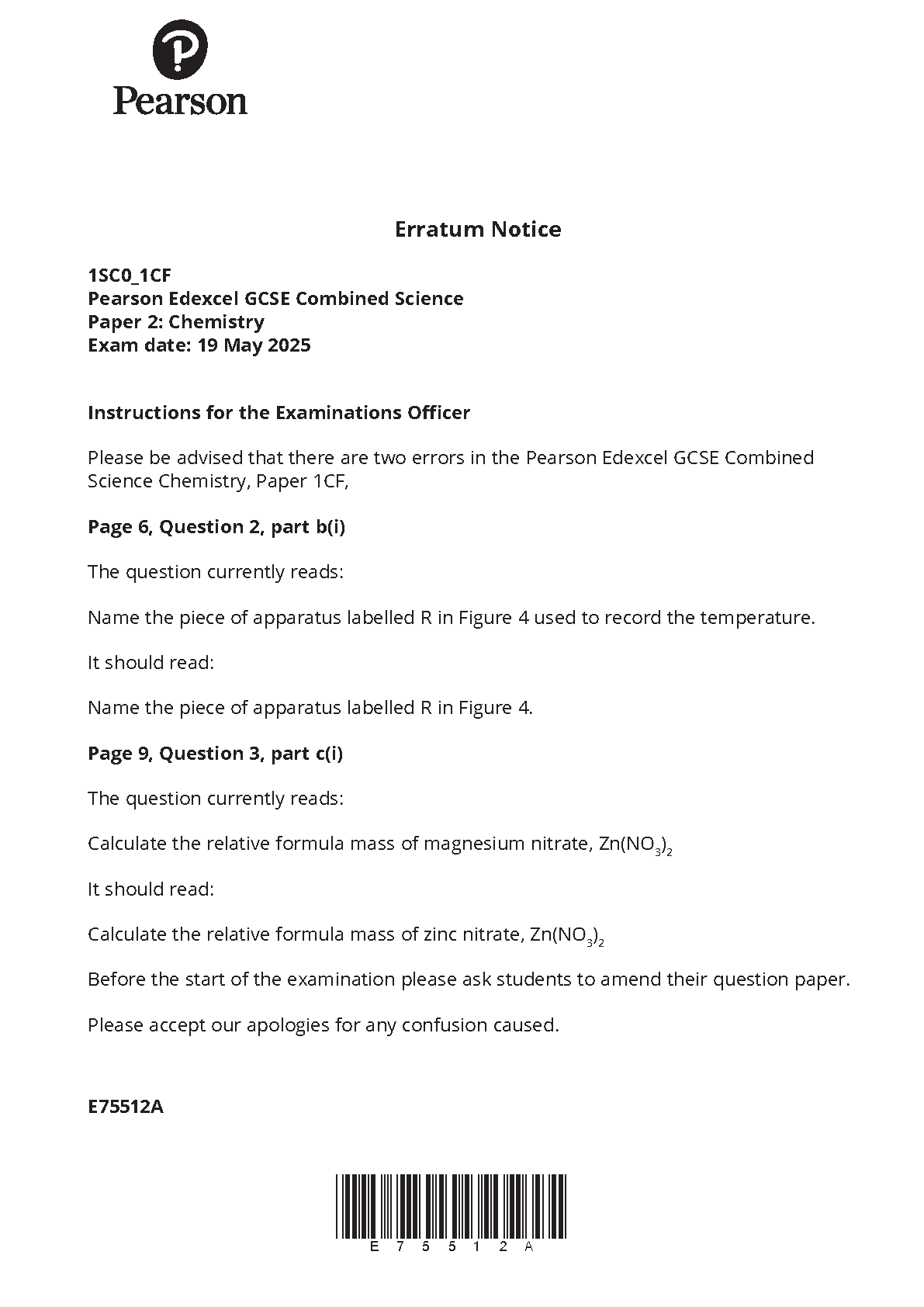 2025 Pearson Edexcel GCSE Combined Science Chemistry Paper 2 and Mark Scheme Combined (1SC0/1CF: Foundation Tier)