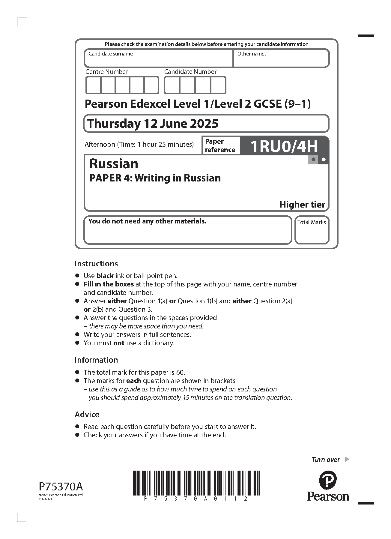Download the 2025 Pearson Edexcel GCSE Russian Paper 4H (Higher Tier) question paper and official mark scheme for specification 1RU0/4H, focusing on Writing in Russian. This paper is part of the Pearson Edexcel GCSE (9–1) Russian qualification and is designed for Higher Tier students, targeting grades 4–9.