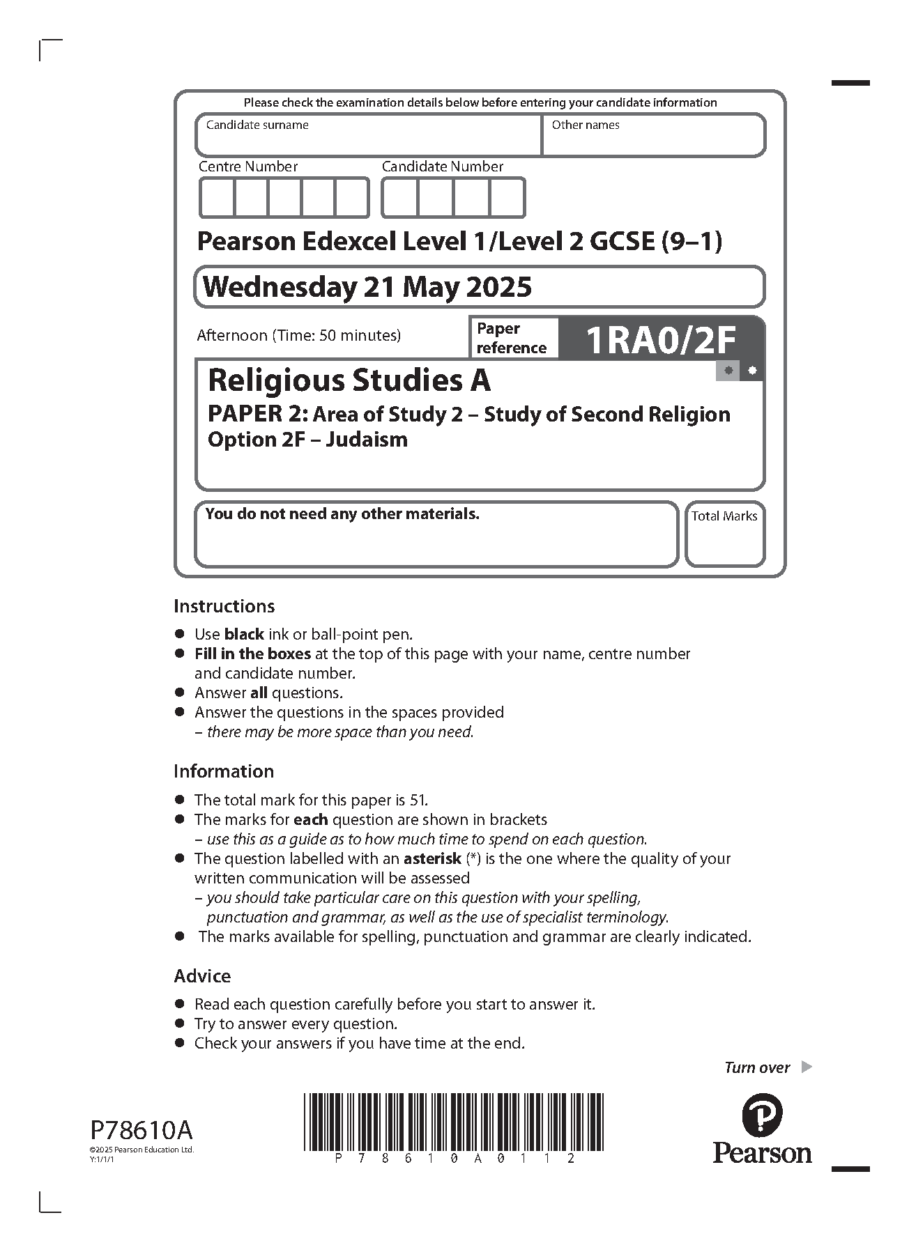 Download the 2025 Pearson Edexcel GCSE Religious Studies A Paper 2 (Judaism) question paper and mark scheme for specification 1RA0/2F. This paper is part of the Pearson Edexcel GCSE (9–1) Religious Studies A qualification and assesses students’ understanding of Judaism.