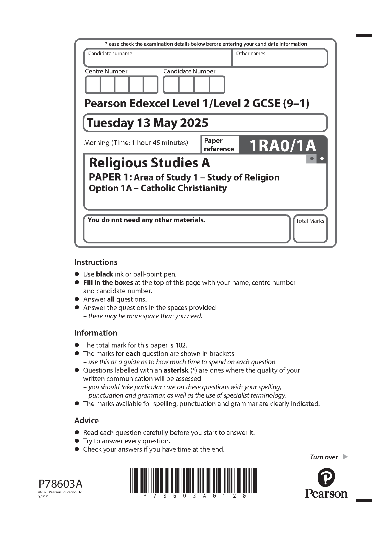 Download the 2025 Pearson Edexcel GCSE Religious Studies A Paper 1 (Catholic Christianity) question paper and mark scheme for specification 1RA0/1A. This paper is part of the Pearson Edexcel GCSE (9–1) Religious Studies A qualification and assesses students’ understanding of Catholic Christianity.
