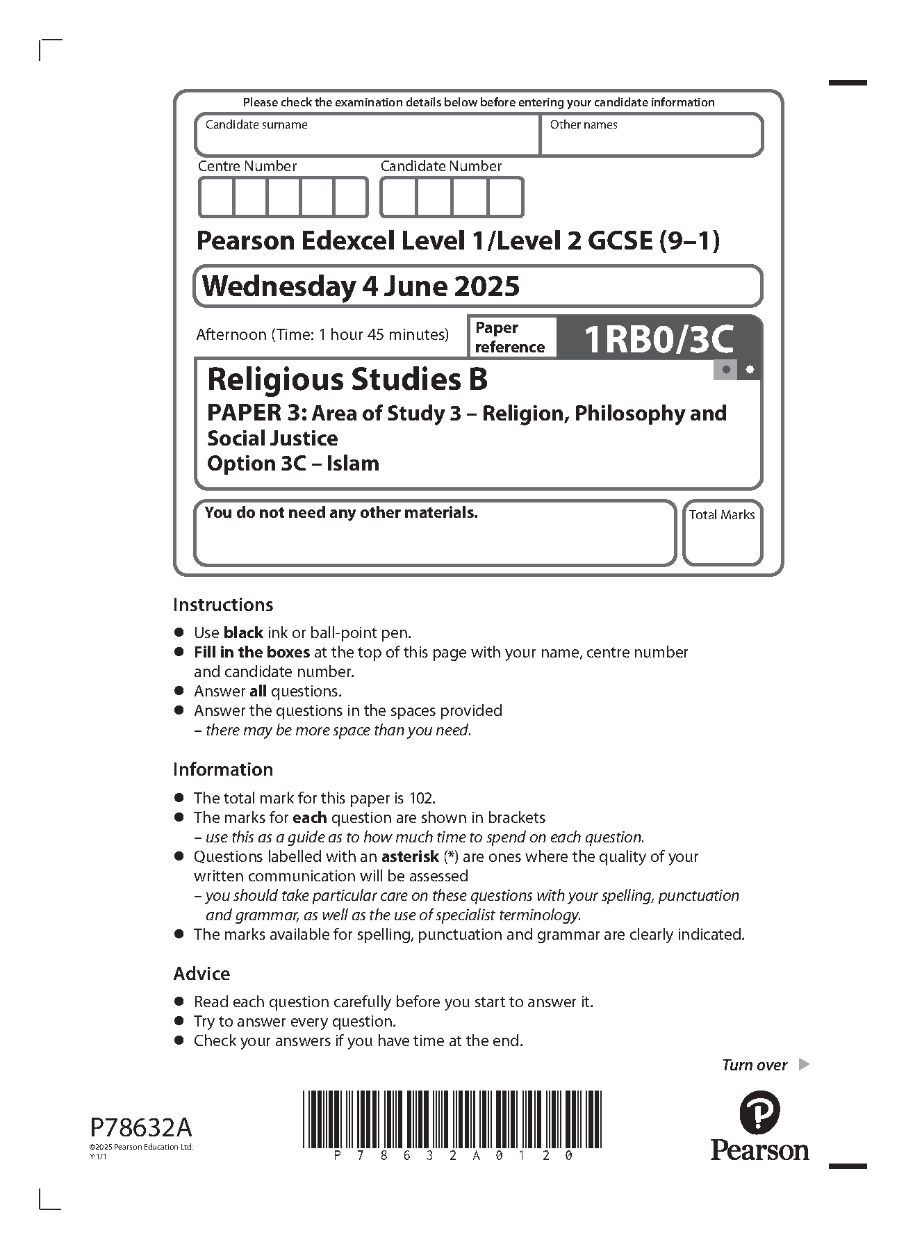 Download the 2025 Pearson Edexcel GCSE Religious Studies B Paper 3 (Islam) question paper and mark scheme for specification 1RB0/3C. This paper is part of the Pearson Edexcel GCSE (9–1) Religious Studies B qualification and assesses students’ understanding of Islam.