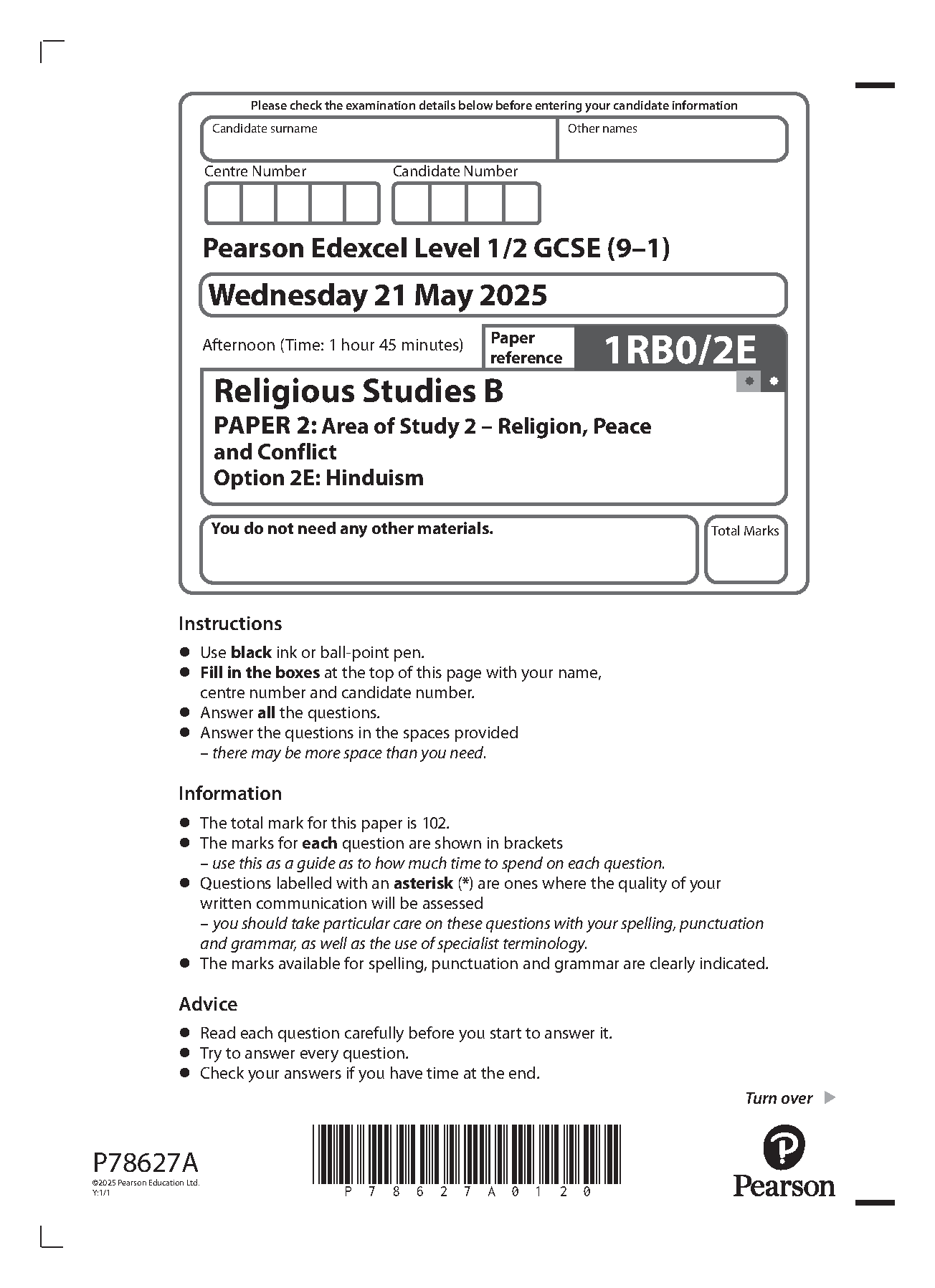 2025 Pearson Edexcel GCSE Religious Studies B PAPER 2 and Mark Scheme Combined (1RB0/2E: Hinduism)