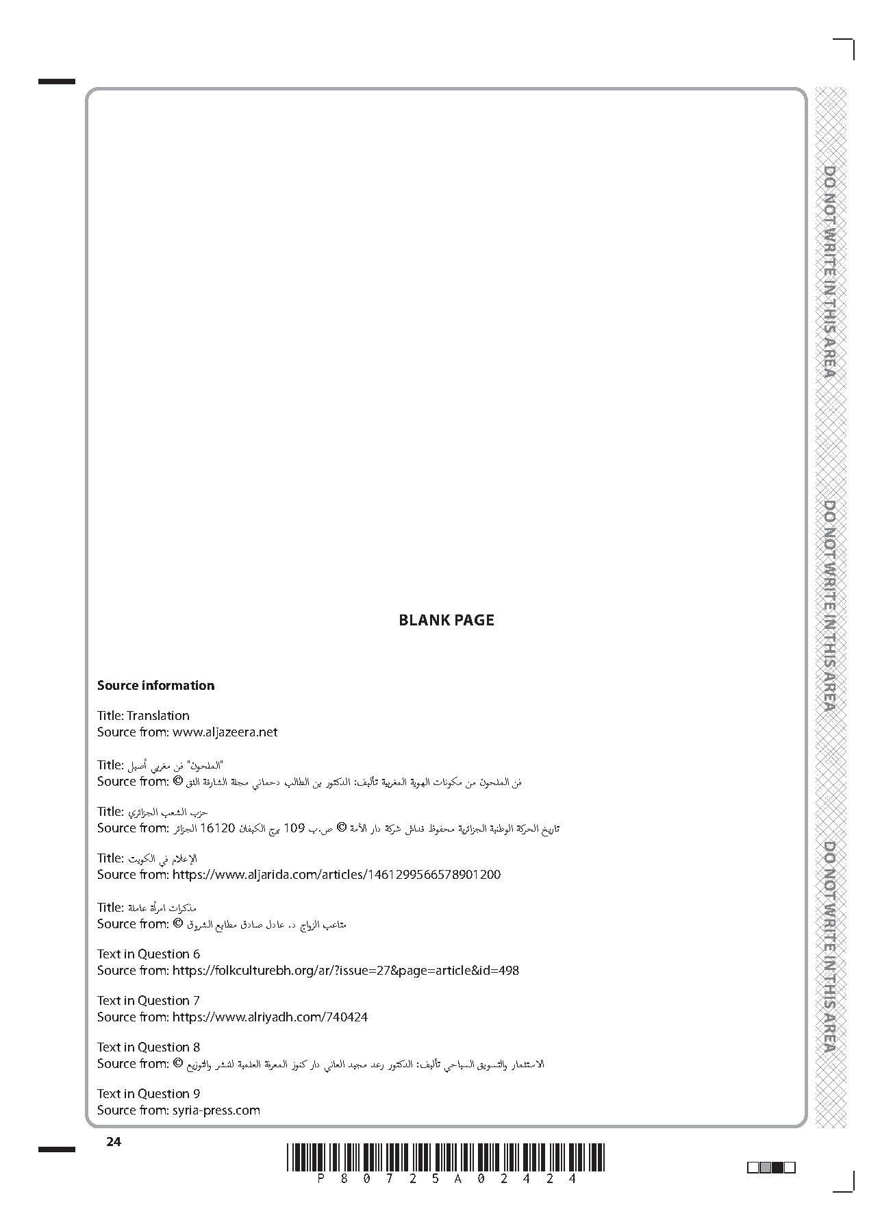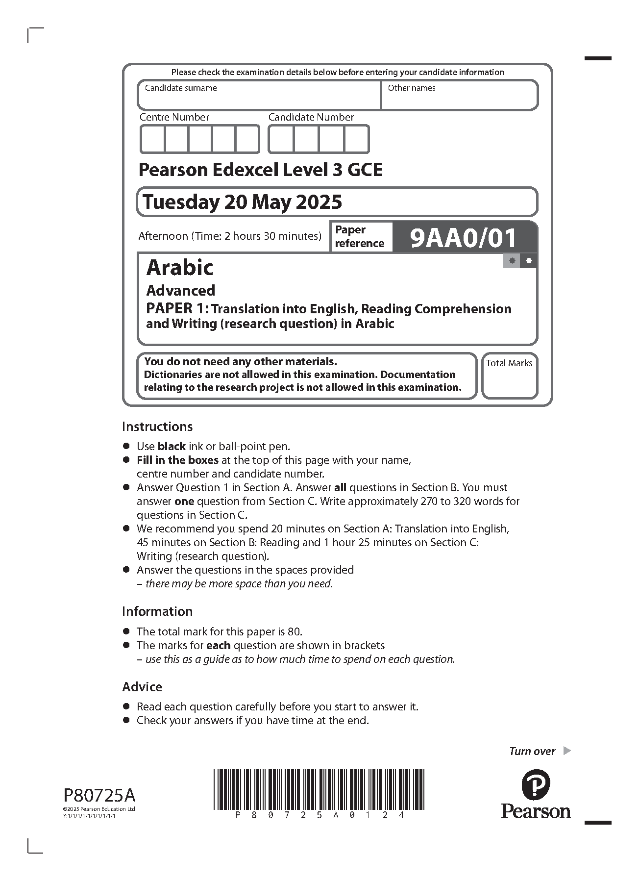 2025 Pearson Edexcel A Level Arabic PAPER 1 and Mark Scheme Combined (9AA0/01: Translation into English, Reading Comprehension and Writing (research question) in Arabic)