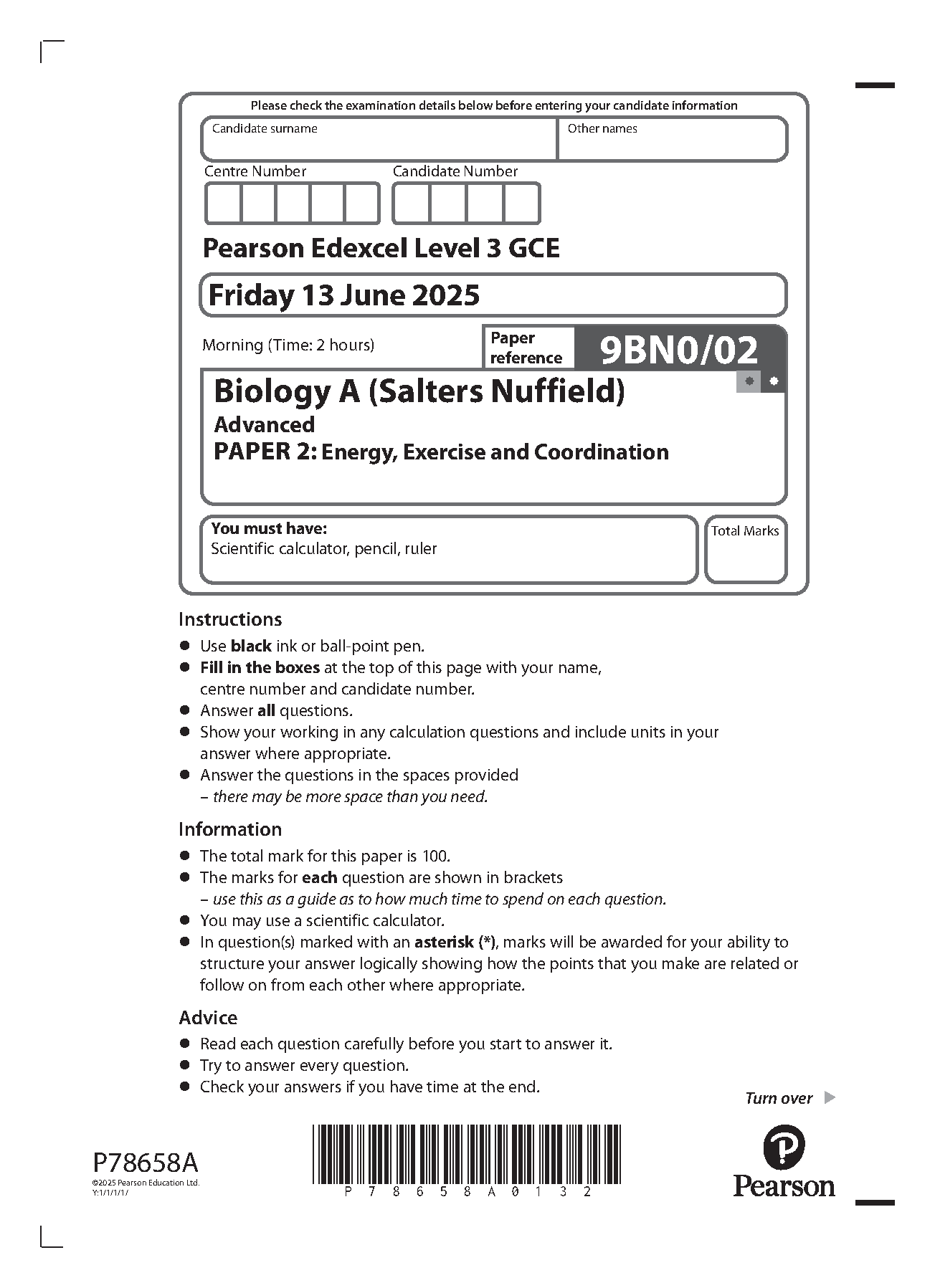 2025 Pearson Edexcel A Level Biology A PAPER 2 and Mark Scheme Combined (9BN0/02: Energy, Exercise and Coordination)