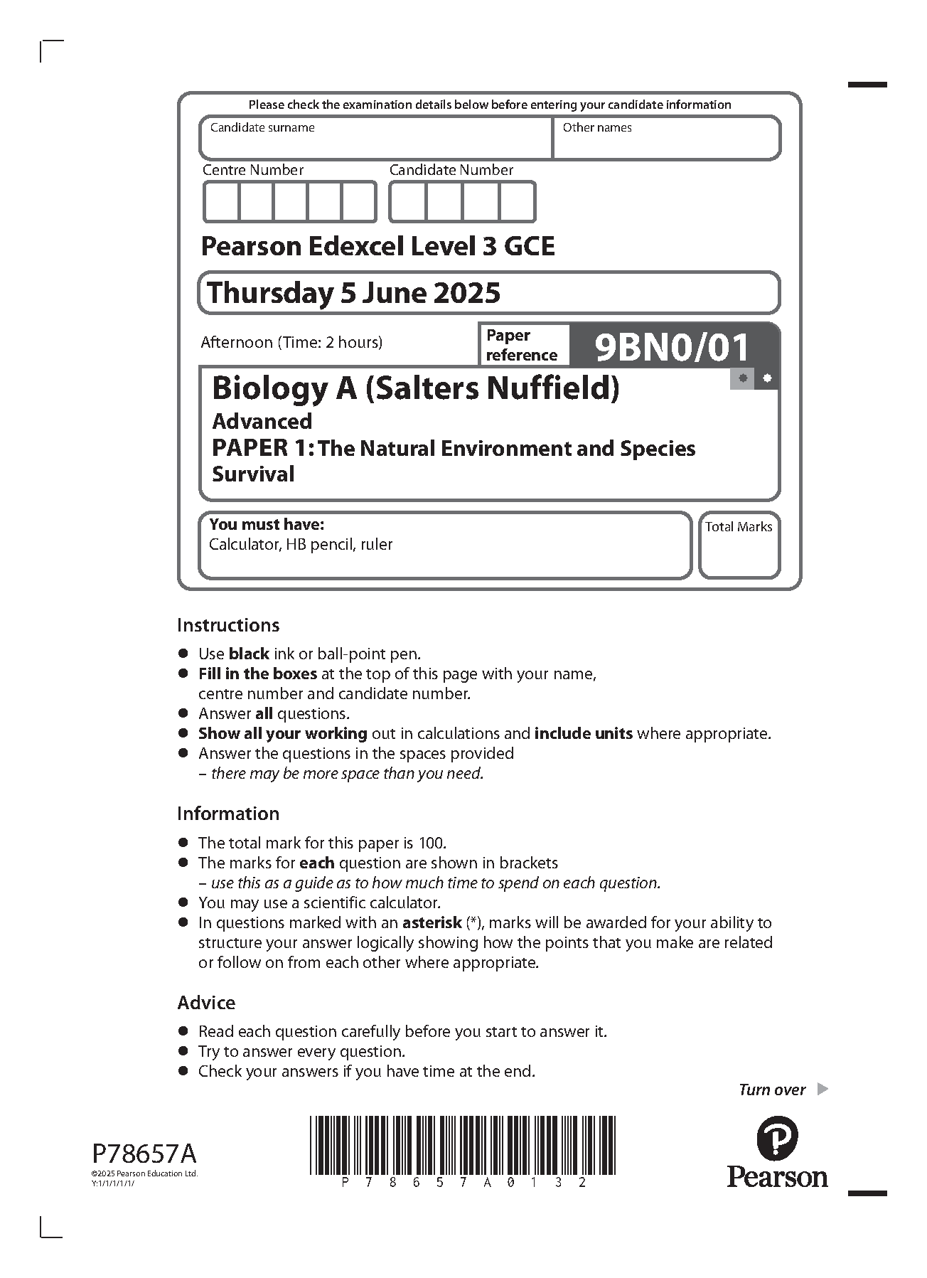 2025 Pearson Edexcel A Level Biology A PAPER 1 and Mark Scheme Combined (9BN0/01: The Natural Environment and Species Survival)