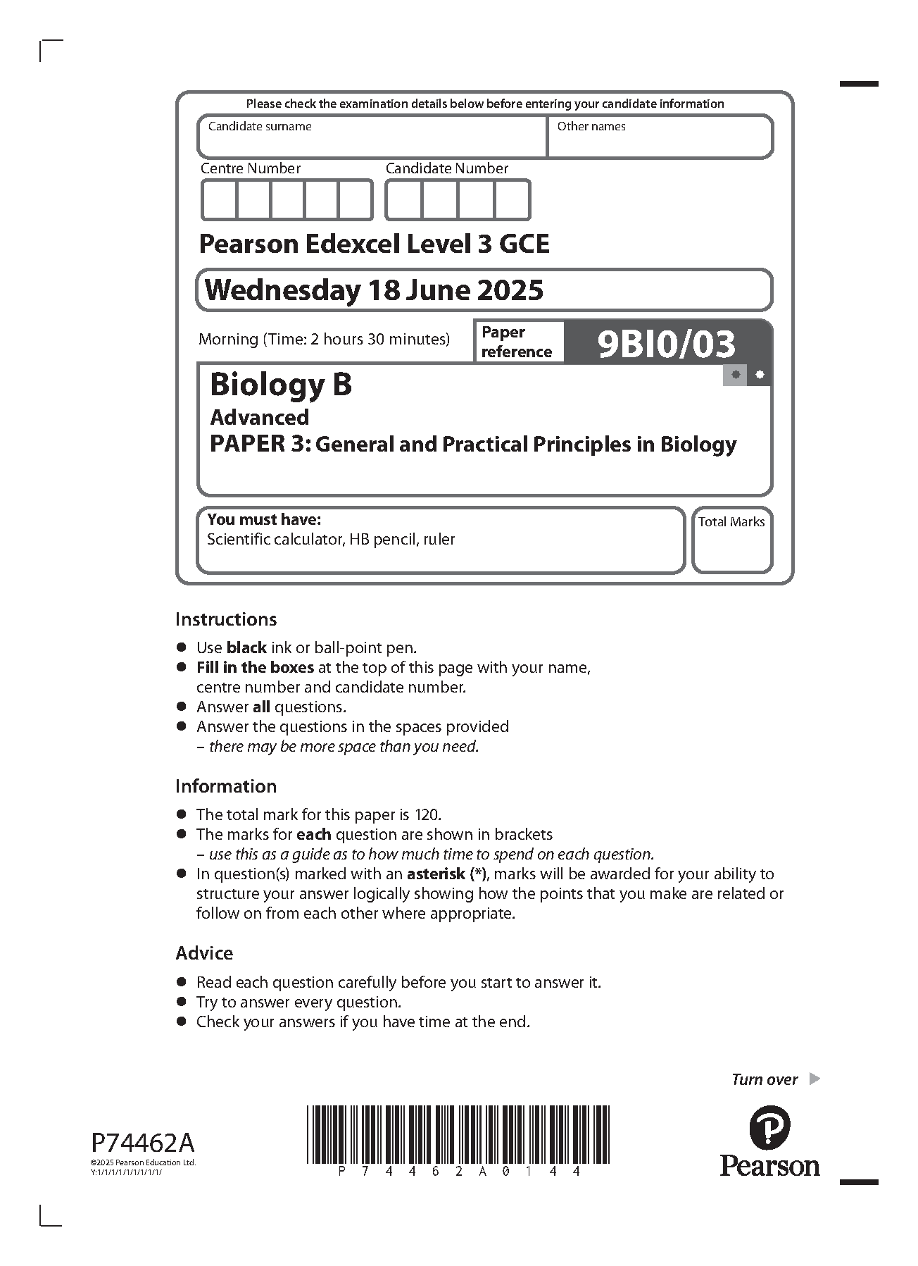 2025 Pearson Edexcel A Level Biology B PAPER 3 and Mark Scheme Combined (9BI0/03: General and Practical Principles in Biology)
