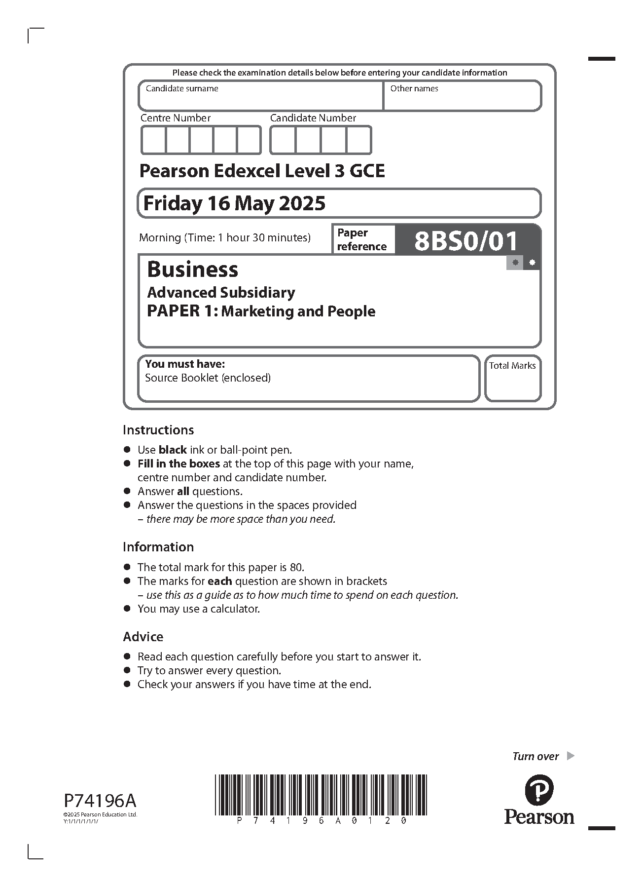 2025 Pearson Edexcel AS Level Business PAPER 1 and Mark Scheme Combined (8BS0/01: Marketing and People)