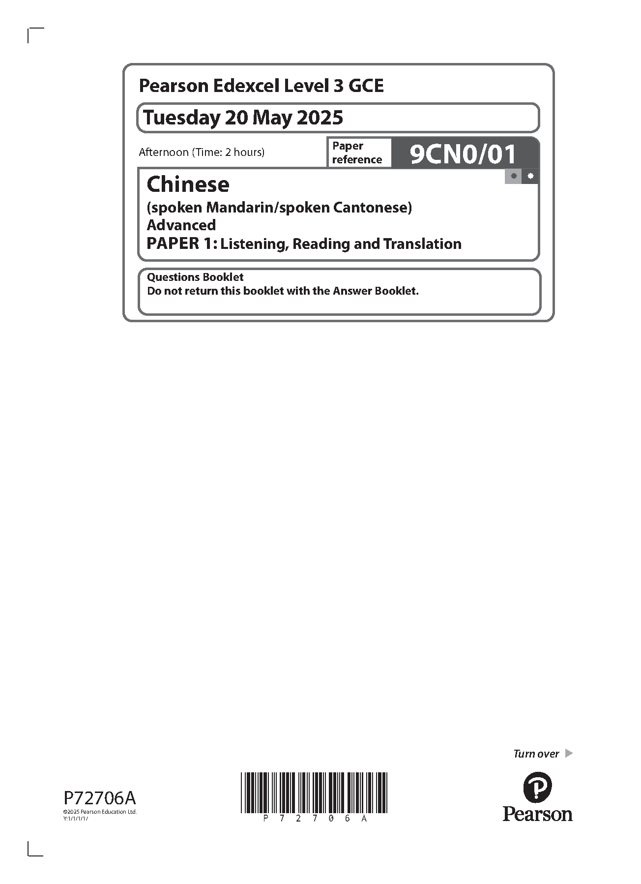 2025 Pearson Edexcel A Level Chinese PAPER 1 and Mark Scheme Combined (9CN0/01: Listening, Reading and Translation)