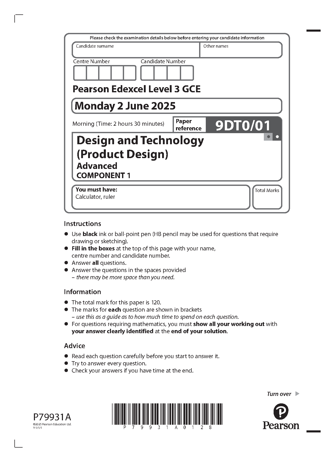 2025 Pearson Edexcel A Level Design and Technology PAPER 1 and Mark Scheme Combined (9DT0/01: Product Design)
