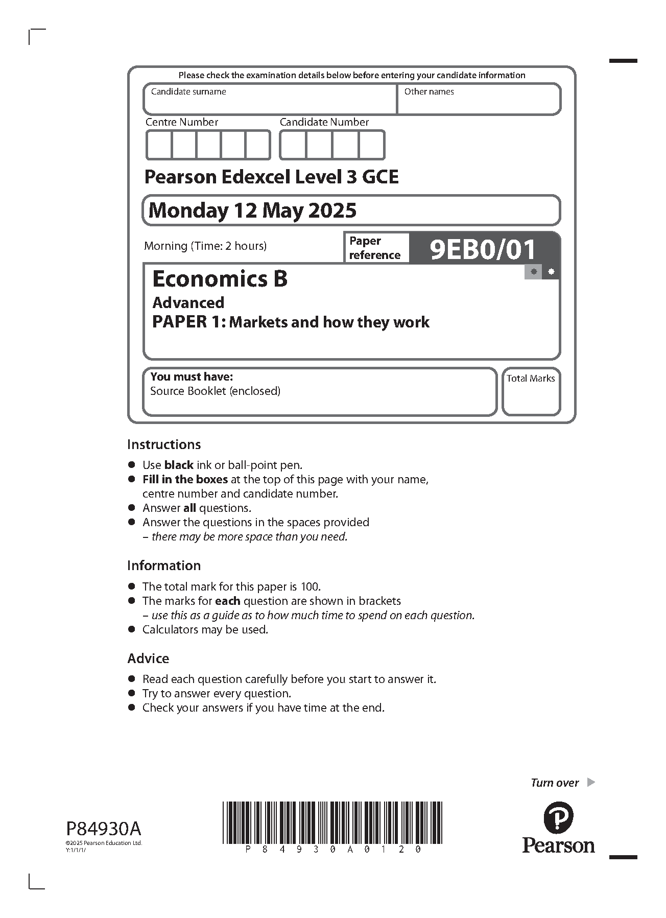 2025 Pearson Edexcel A Level Economics B Paper 1 and Mark Scheme Combined (9EB0/01: Markets and how they work)