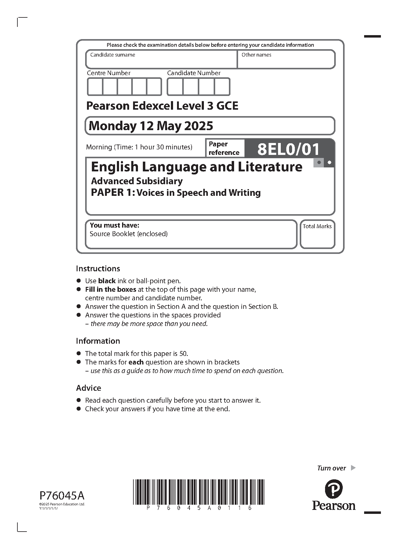 2025 Pearson Edexcel AS Level English Language and Literature Paper 1 and Mark Scheme Combined (8EL0/01: Voices in Speech and Writing)