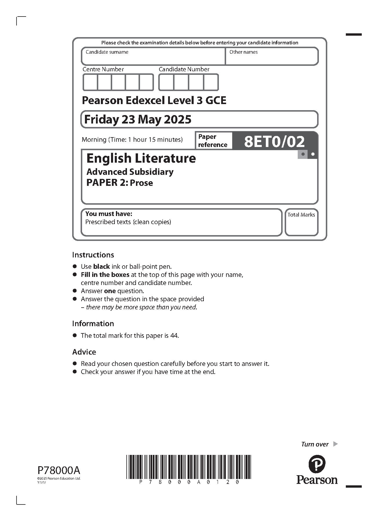 2025 Pearson Edexcel AS Level English Literature Paper 2 and Mark Scheme Combined (8ET0/02: Prose)