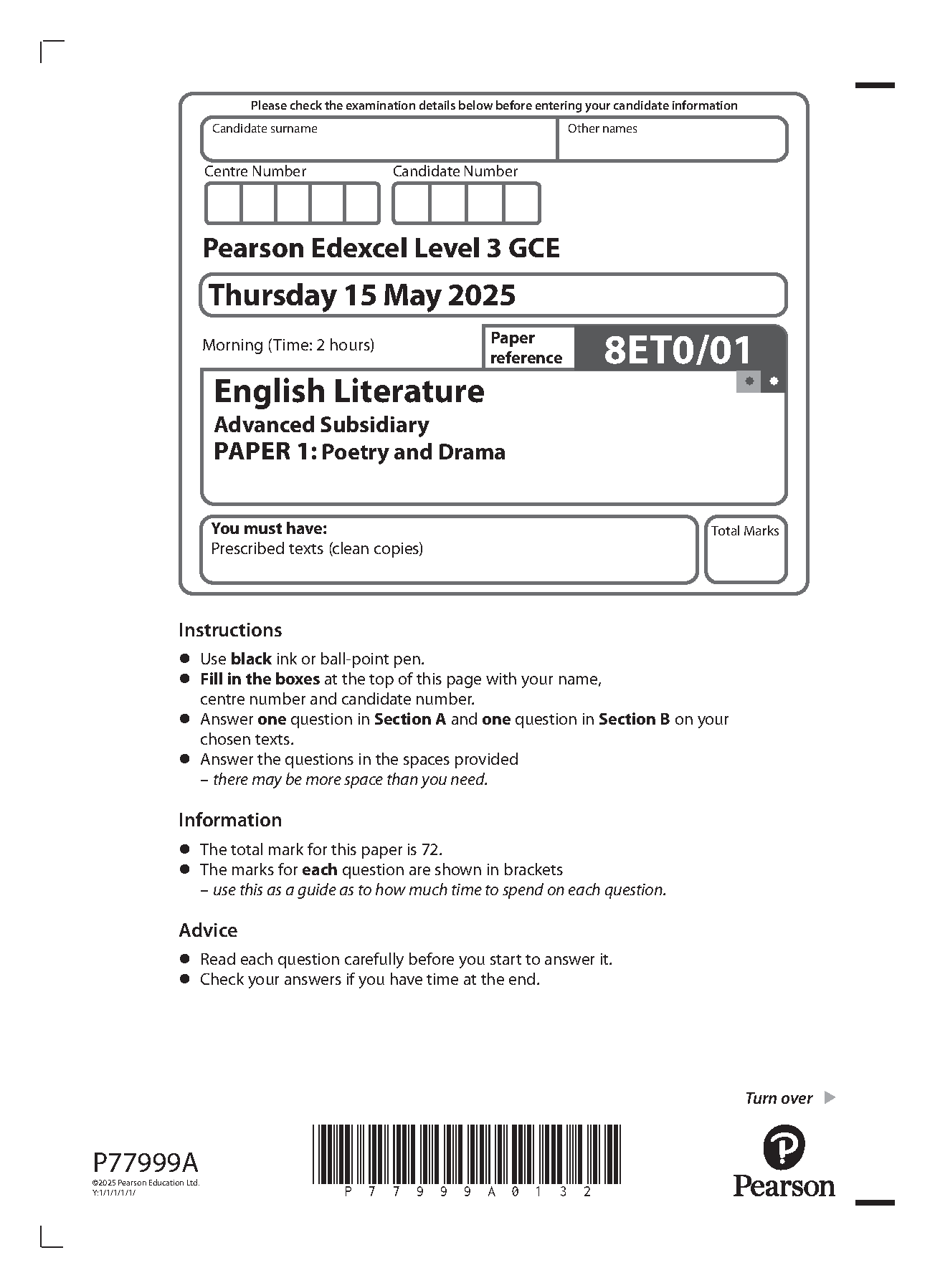 2025 Pearson Edexcel AS Level English Literature Paper 1 and Mark Scheme Combined (8ET0/01: Poetry and Drama)