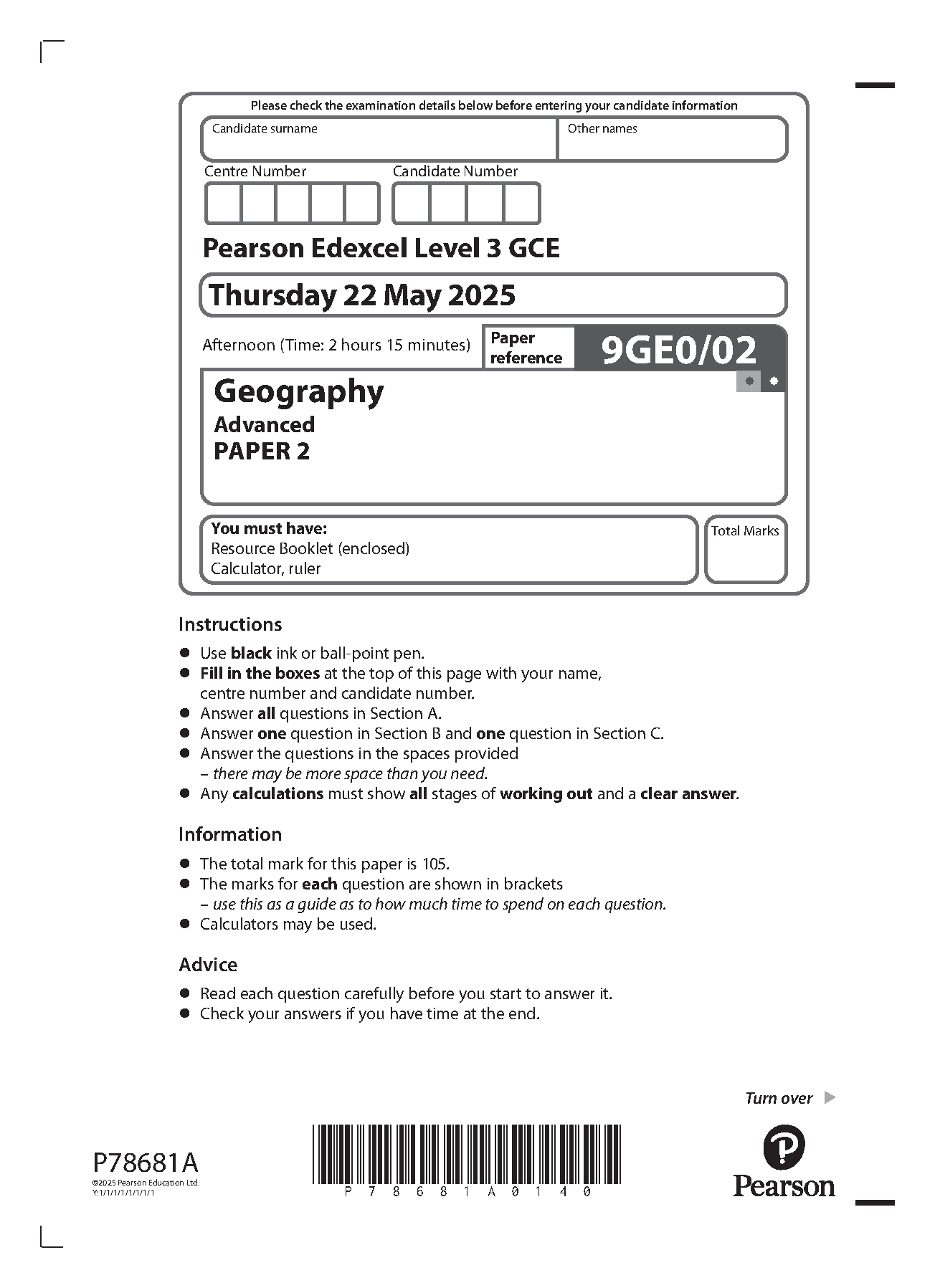 2025 Pearson Edexcel A Level Geography Paper 2 and Mark Scheme Combined (9GE0/02)