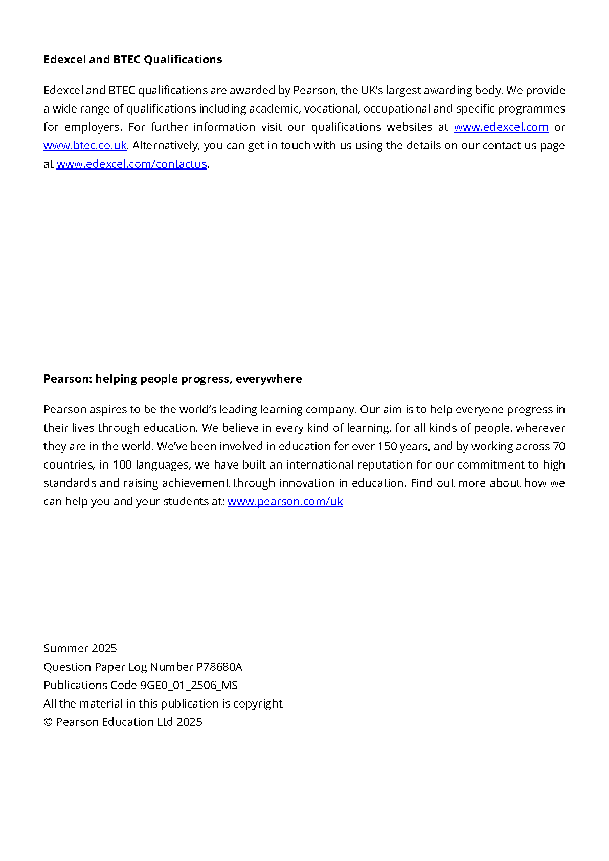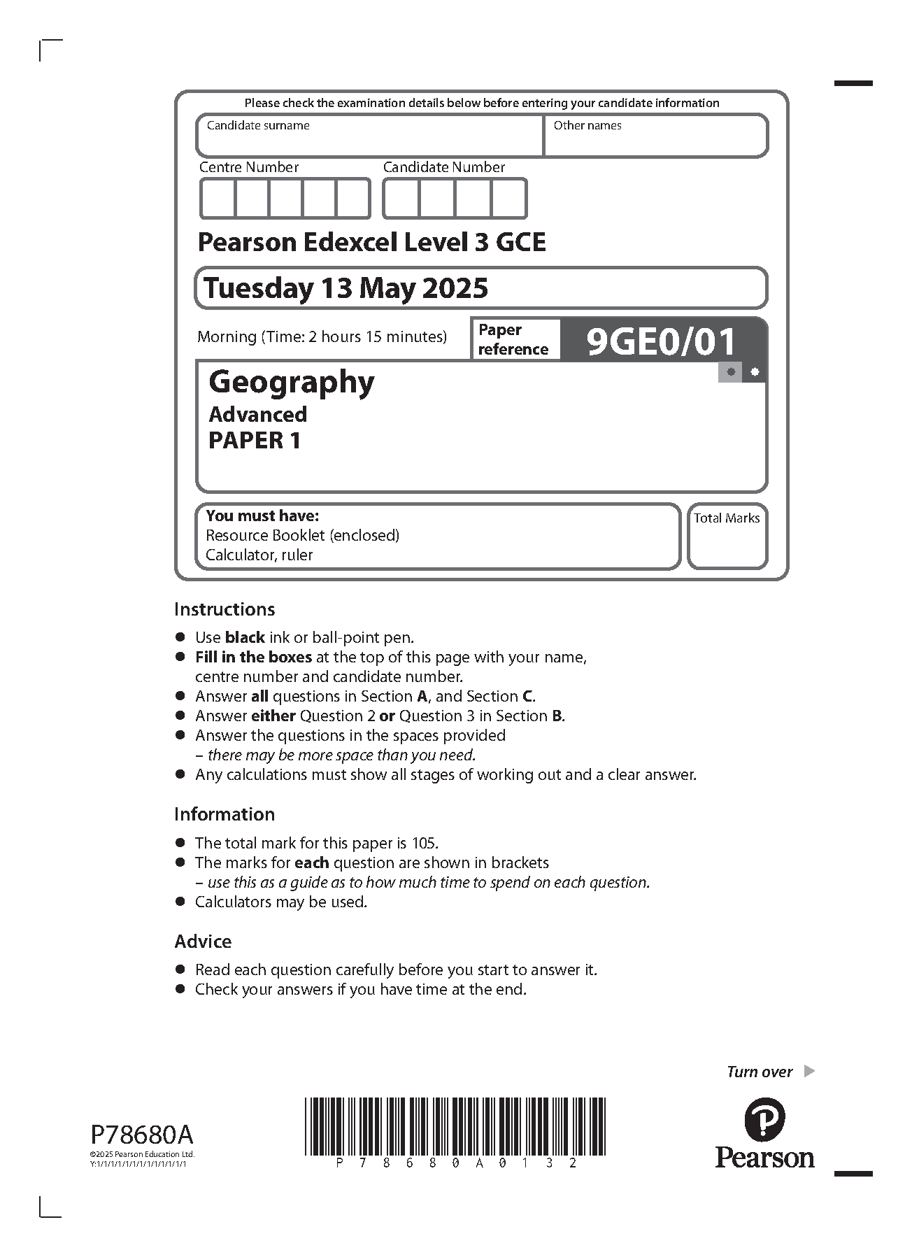 2025 Pearson Edexcel A Level Geography Paper 1 and Mark Scheme Combined (9GE0/01)