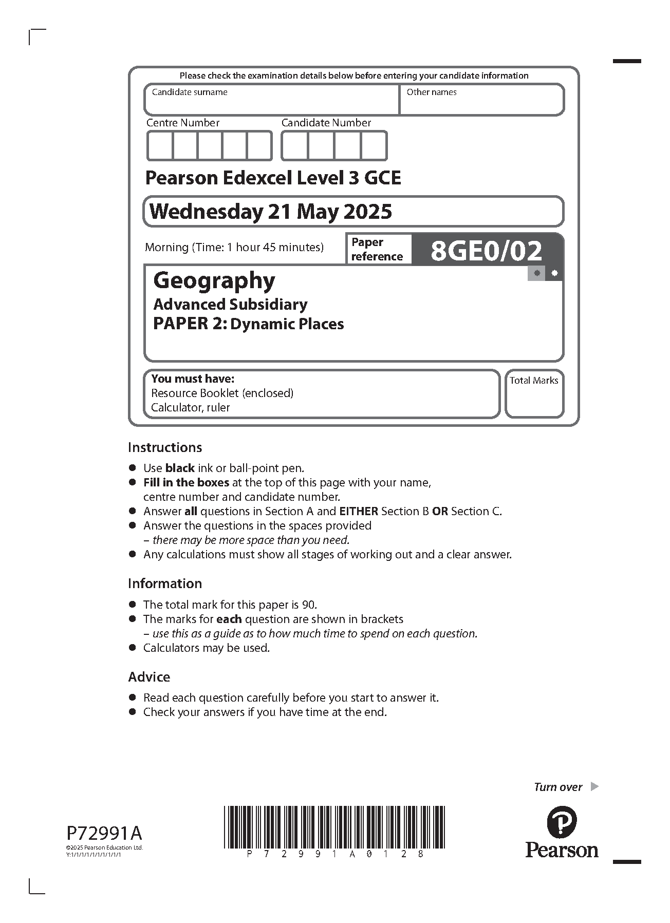 2025 Pearson Edexcel AS Level Geography Paper 2 and Mark Scheme Combined (8GE0/02: Dynamic Places)