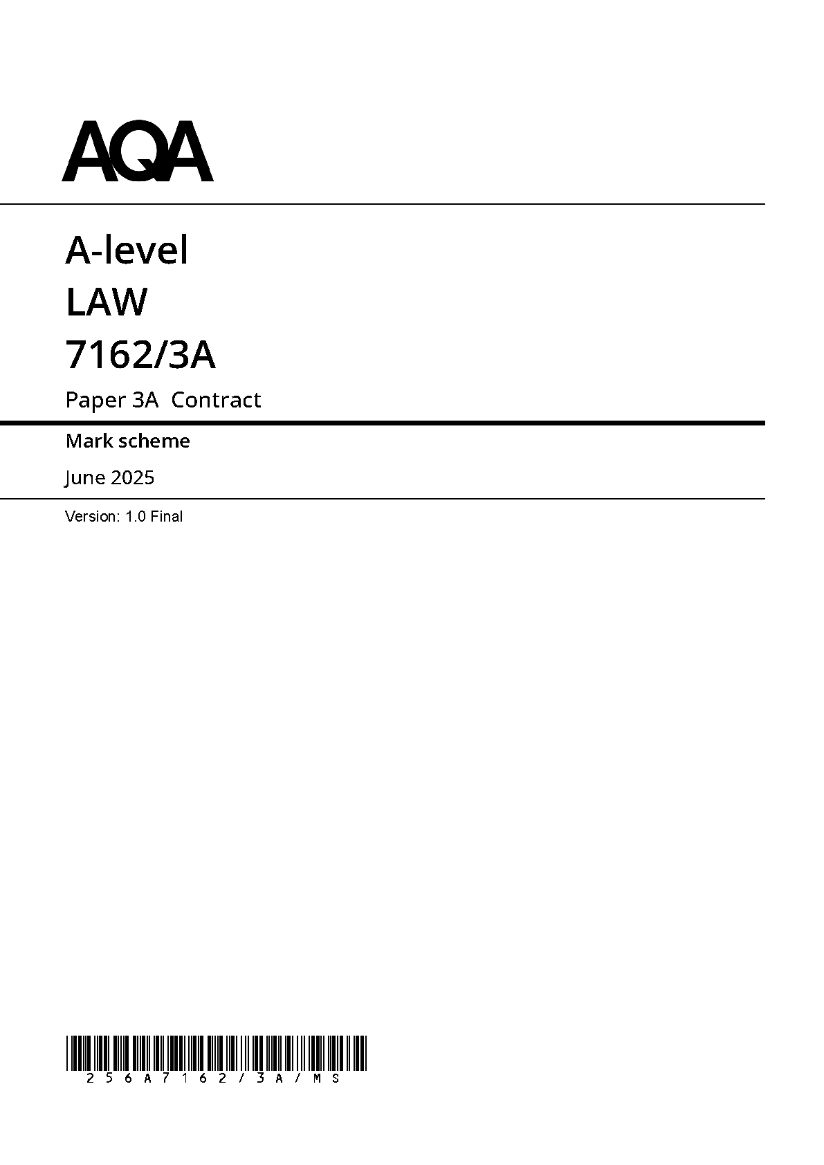 AQA A LEVEL LAW PAPER 3A 2025 MARK SCHEME (7162/3A: Contract). DOWNLOAD this verified paper on www.leakedexams.com and access the PDF INSTANTLY!!!