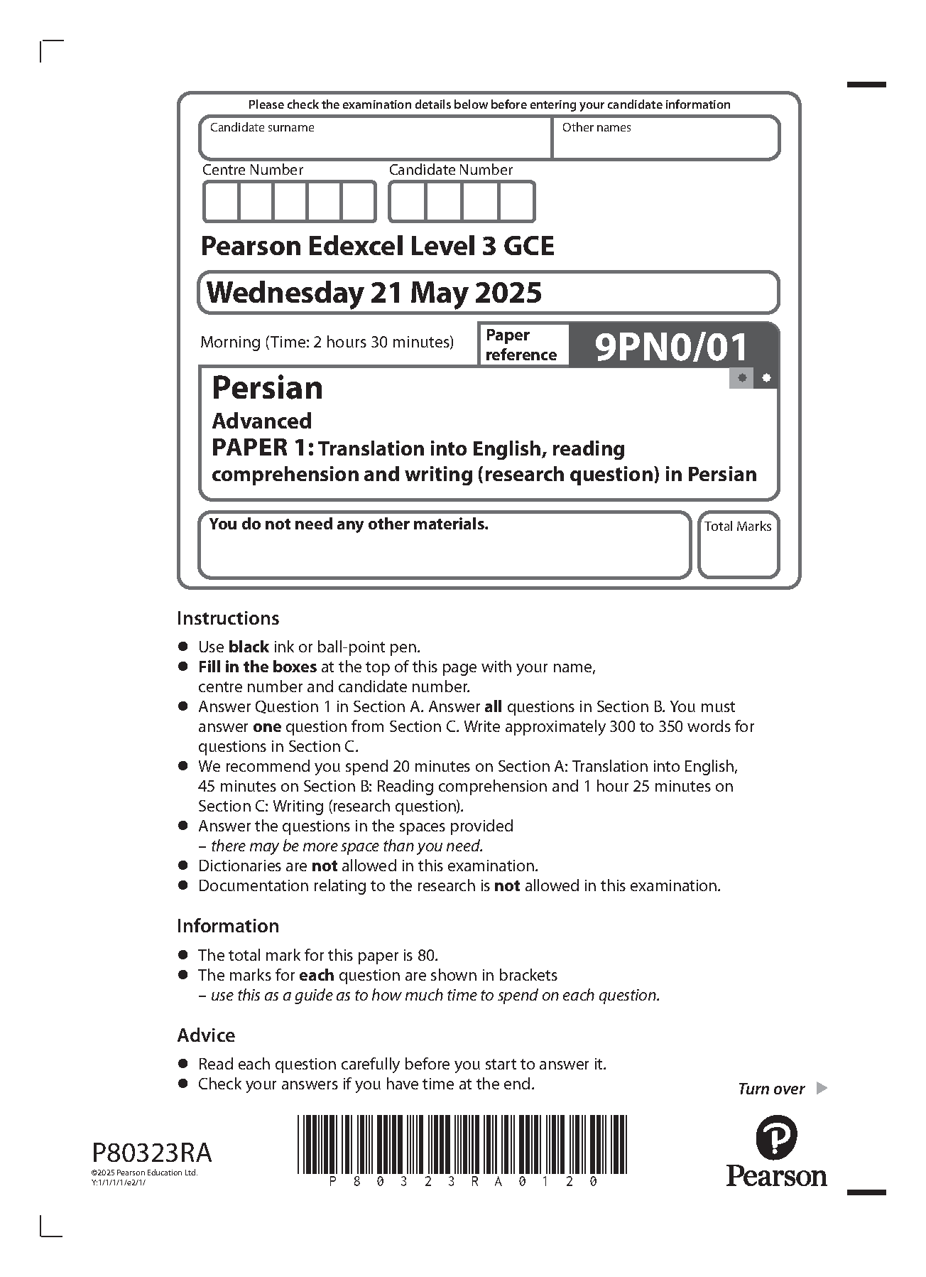 2025 Pearson Edexcel A Level Persian Paper 1 and Mark Scheme Combined (9PN0/01: Translation into English, reading comprehension and writing (research question) in Persian)