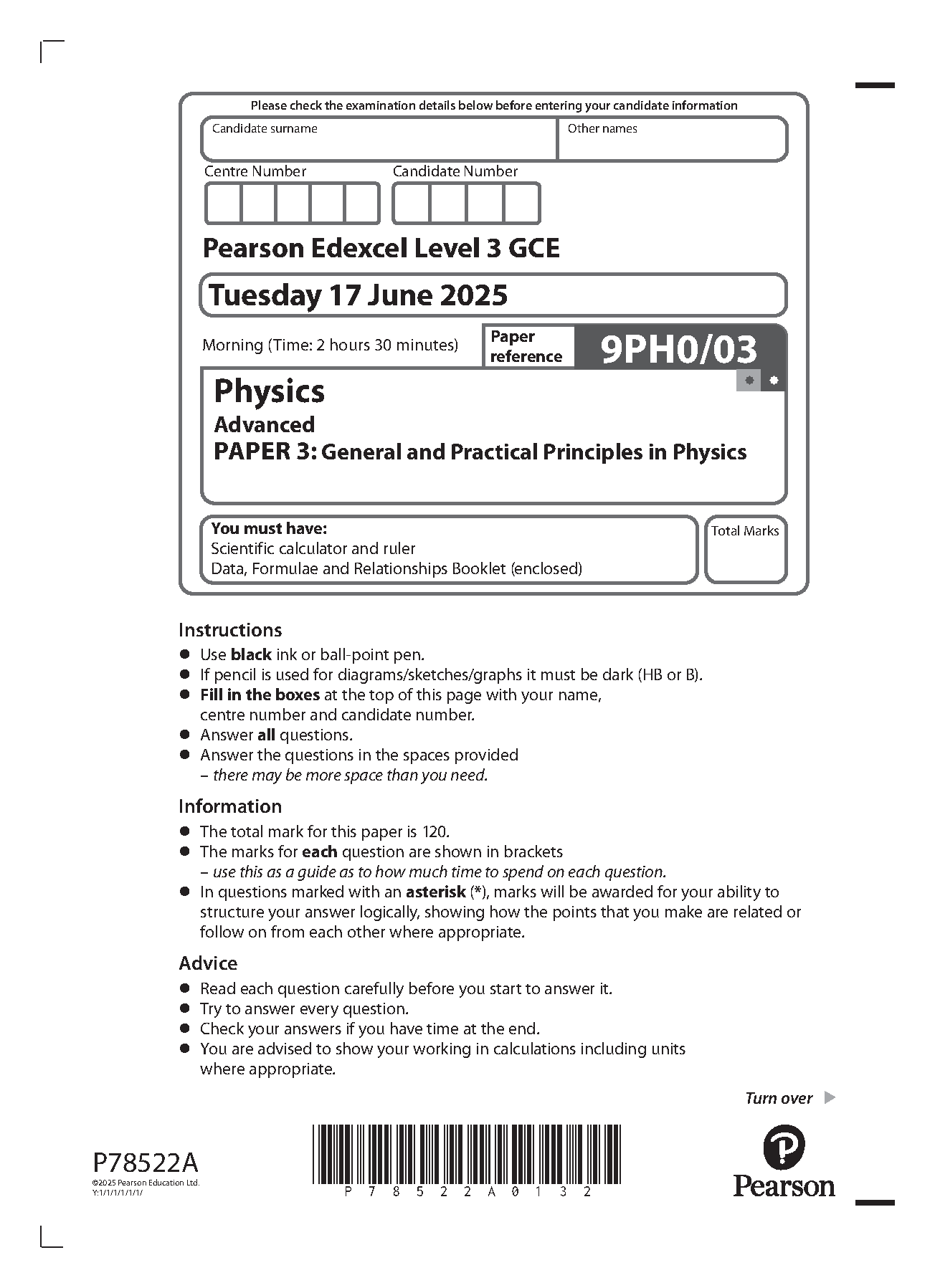 2025 Pearson Edexcel A Level Physics Paper 3 and Mark Scheme Combined (9PH0/03: General and Practical Principles in Physics)