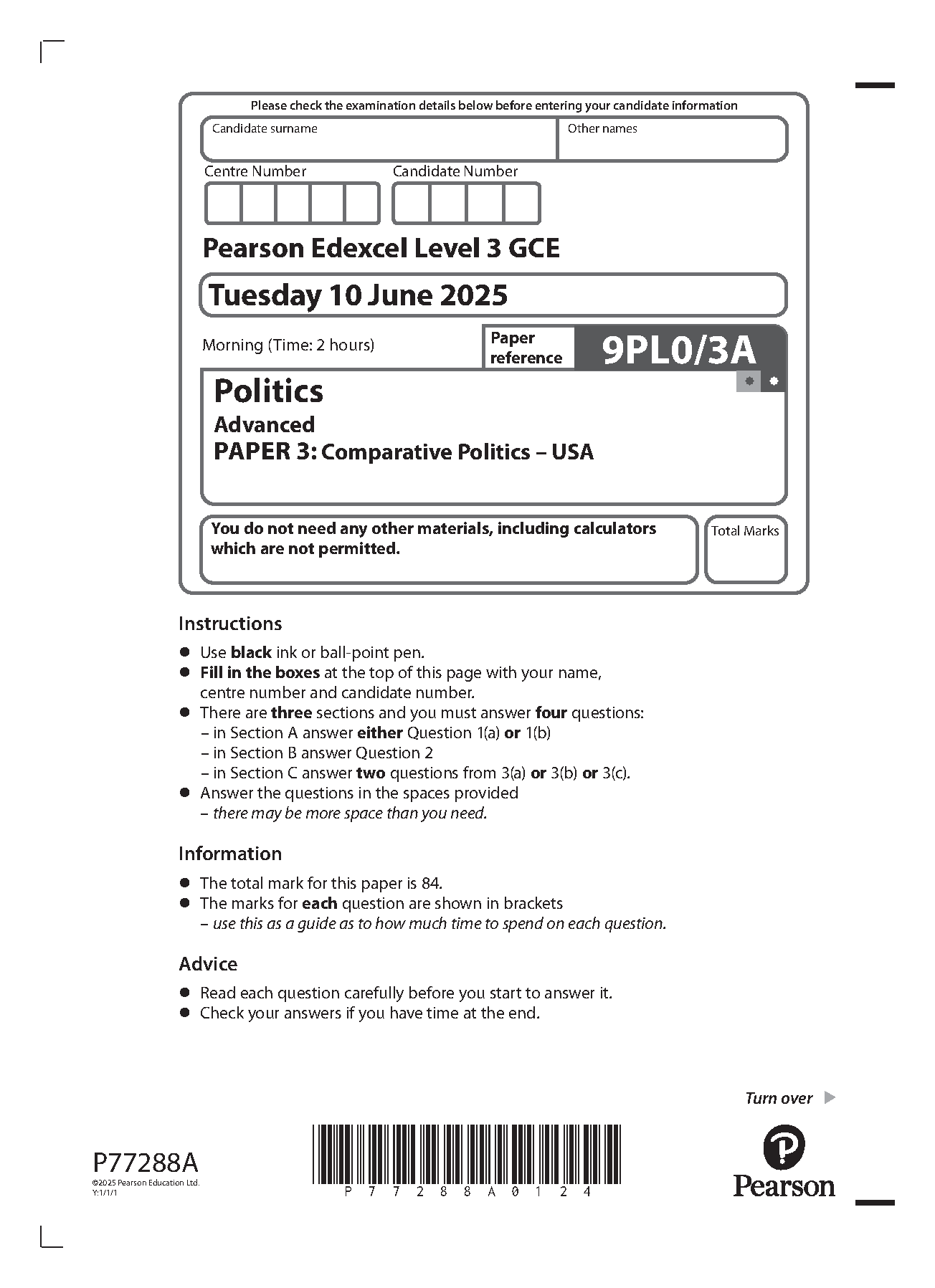 2025 Pearson Edexcel A Level Politics Paper 3 and Mark Scheme Combined (9PL0/3A: Comparative Politics – USA)