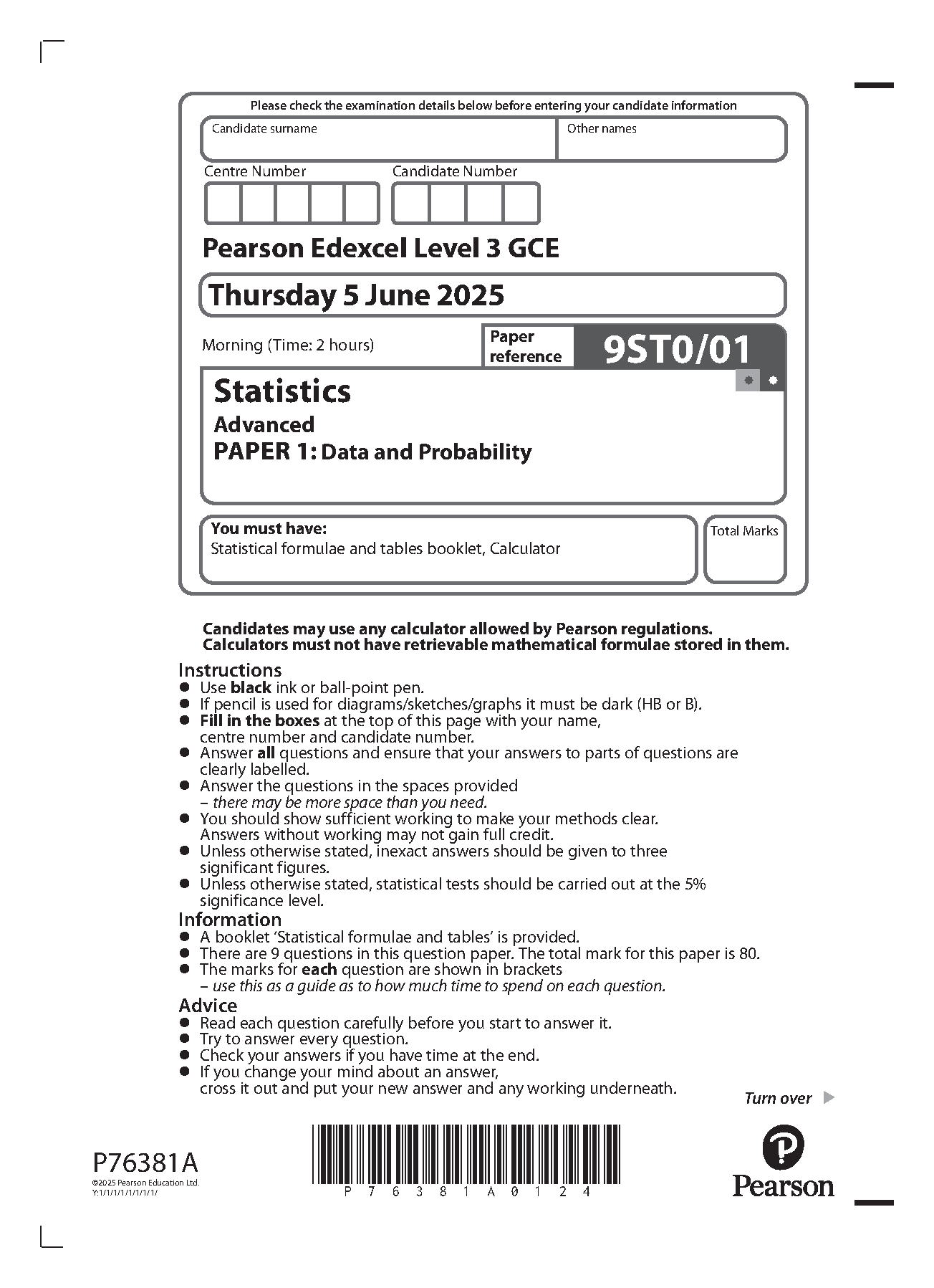 2025 Pearson Edexcel A Level Statistics PAPER 1 and Mark Scheme Combined (9ST0/01: Data and Probability)