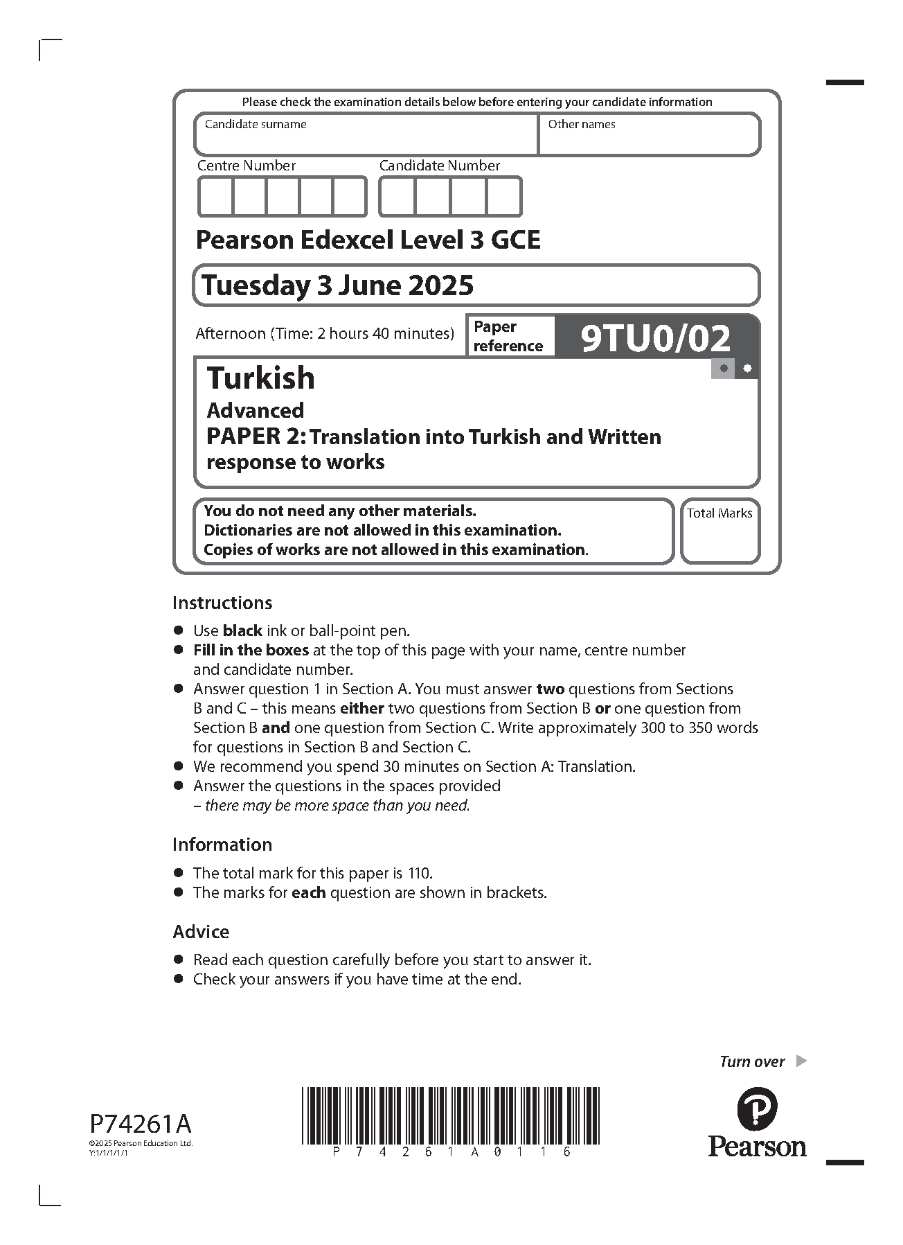 2025 Pearson Edexcel A Level Turkish PAPER 2 and Mark Scheme Combined (9TU0/02: Translation into Turkish and Written response to works)