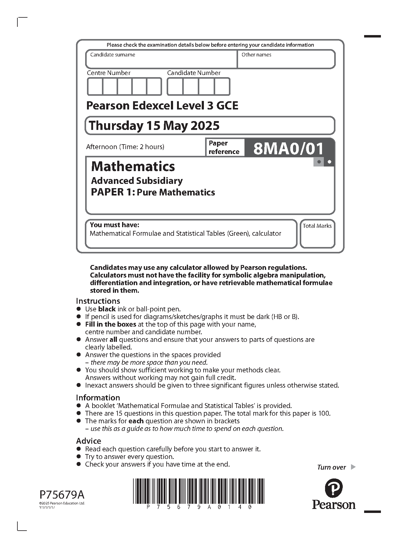 2025 Pearson Edexcel AS Level Mathematics PAPER 1 and Mark Scheme Combined (8MA0/01: Pure Mathematics)