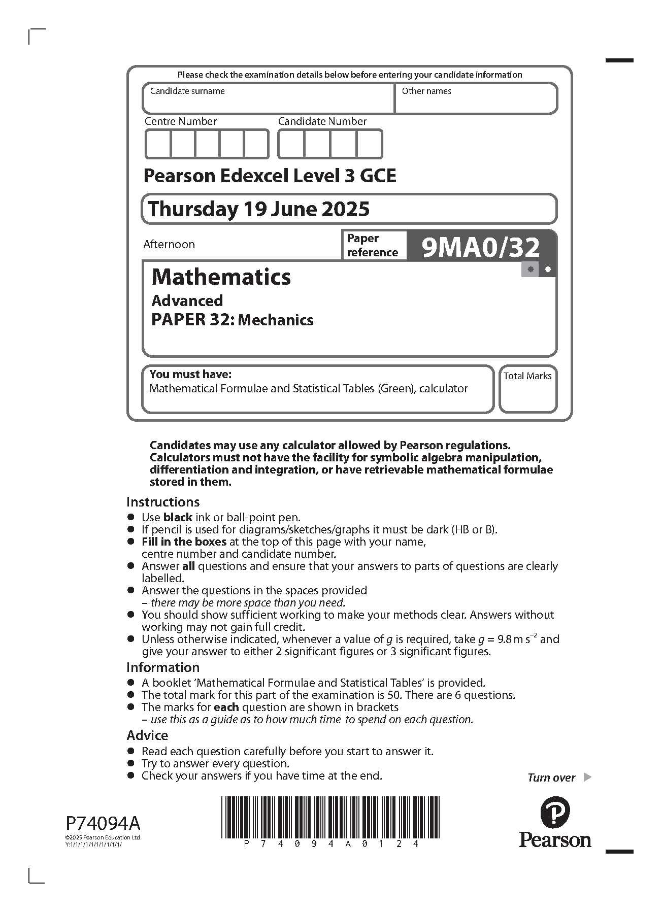 2025 Pearson Edexcel A Level Mathematics PAPER 32 and Mark Scheme Combined (9MA0/32:Mechanics)
