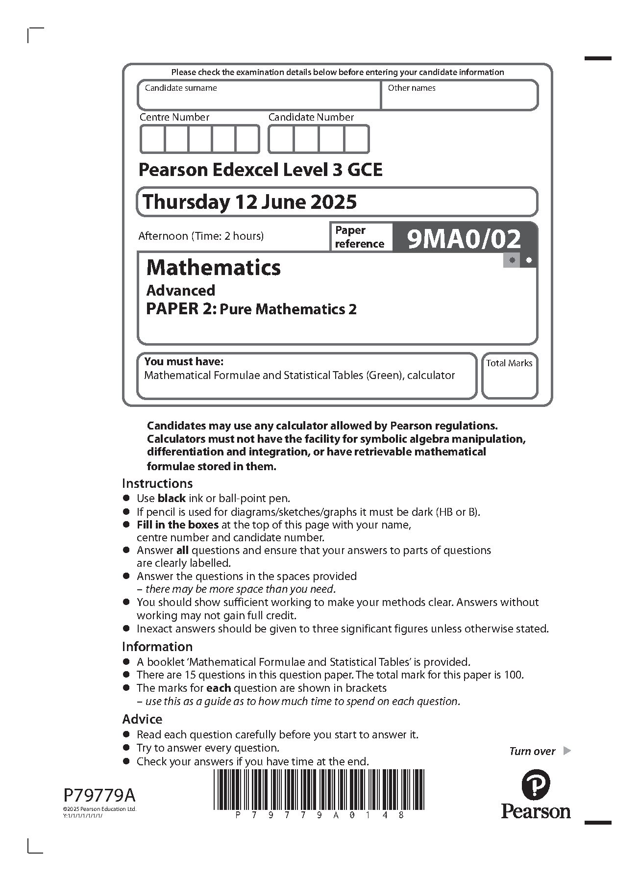2025 Pearson Edexcel A Level Mathematics Paper 2 and Mark Scheme Combined (9MA0/02: Pure Mathematics 2)