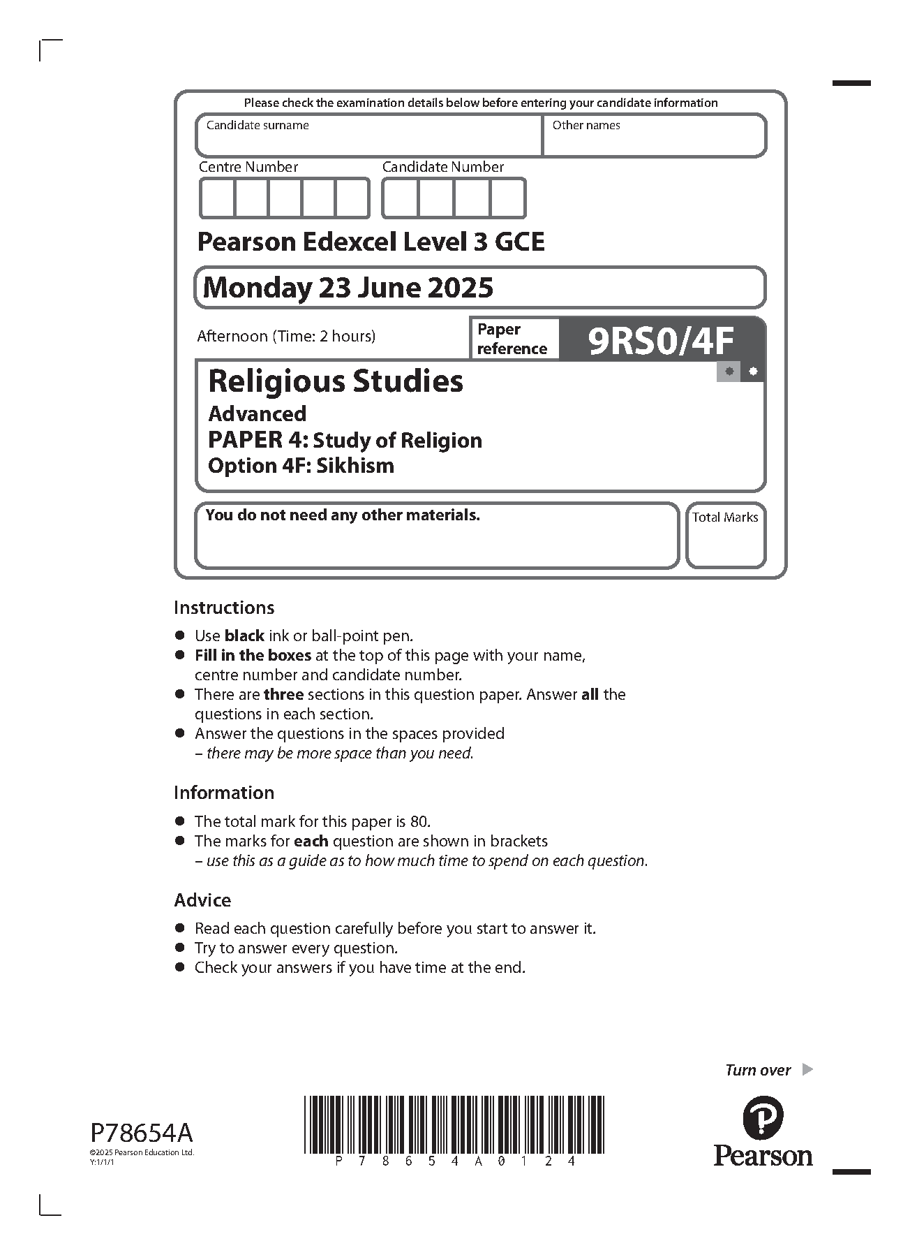 2025 Pearson Edexcel A Level Religious Studies PAPER 4 and Mark Scheme Combined (9RS0/4F: Sikhism)