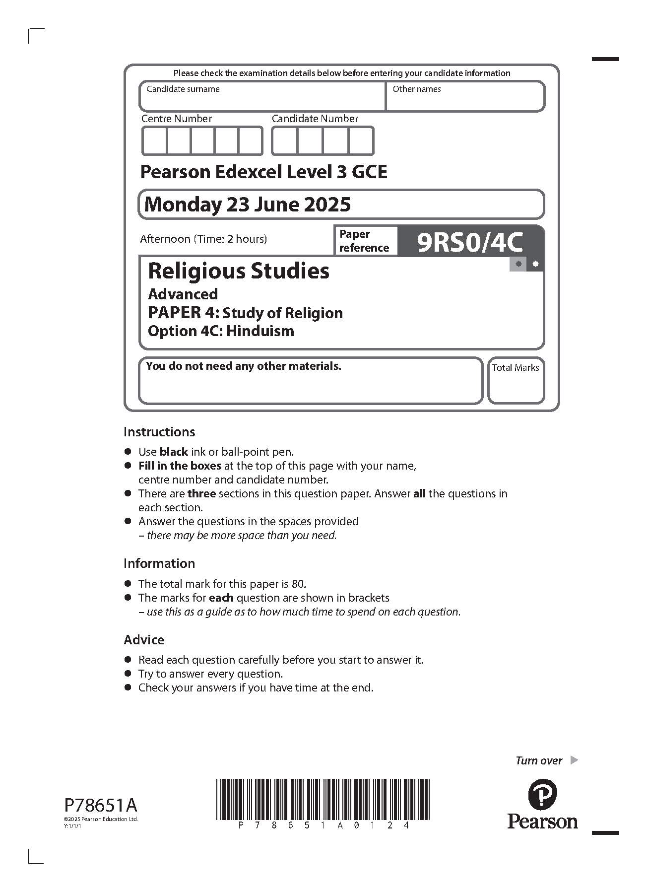 2025 Pearson Edexcel A Level Religious Studies PAPER 4 and Mark Scheme Combined (9RS0/4C: Hinduism)