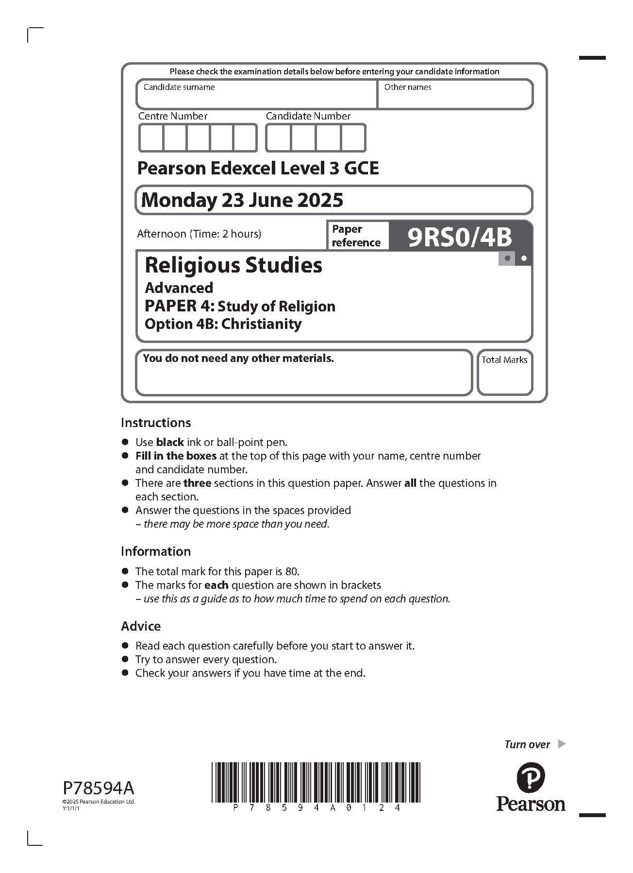 2025 Pearson Edexcel A Level Religious Studies PAPER 4 and Mark Scheme Combined (9RS0/4B: Christianity)