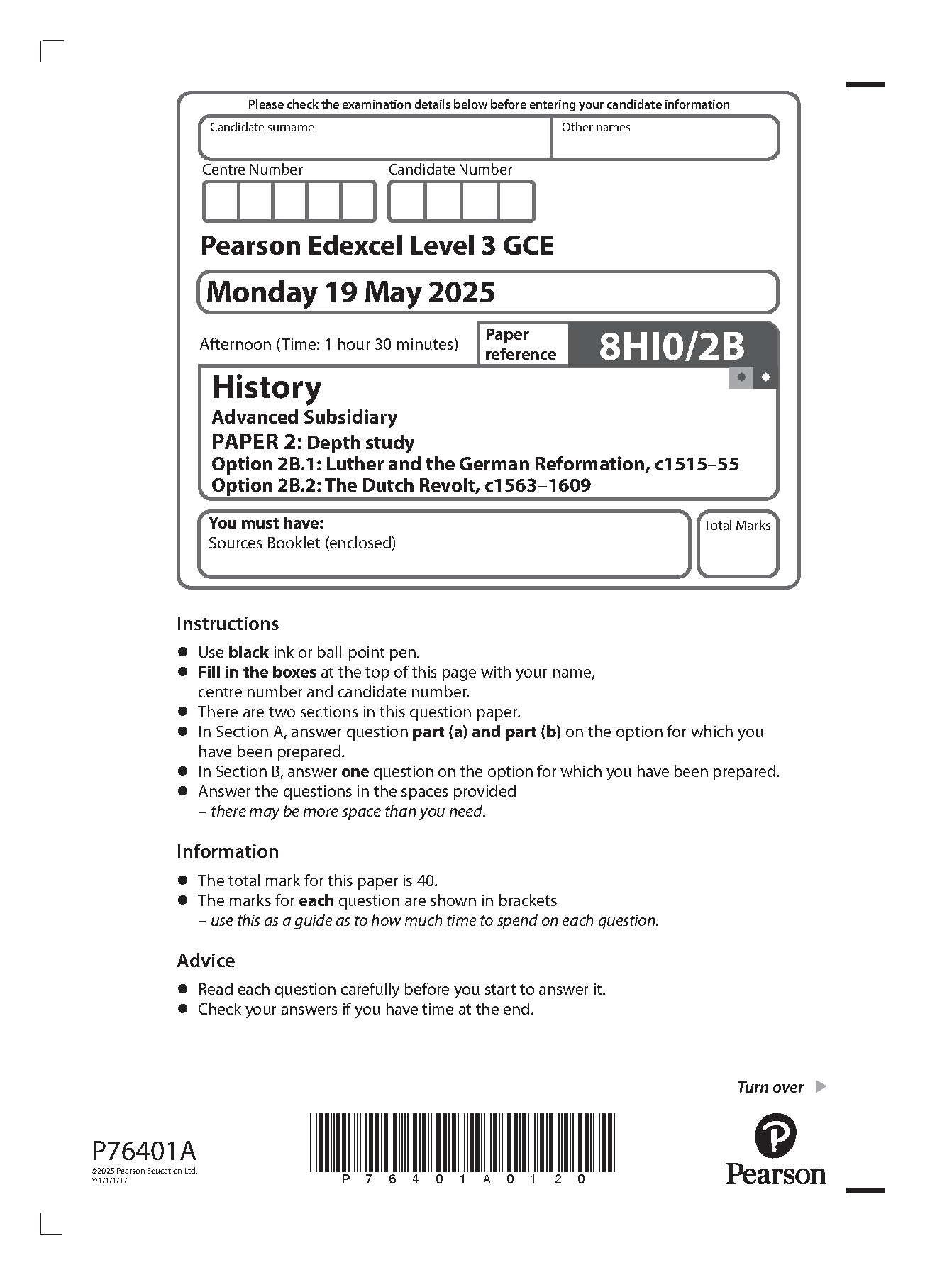 2025 Pearson Edexcel AS Level History Paper 2 and Mark Scheme Combined (8HI0/2B: Luther and the German Reformation, c1515–55)